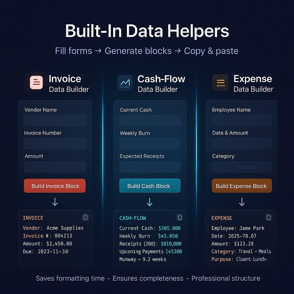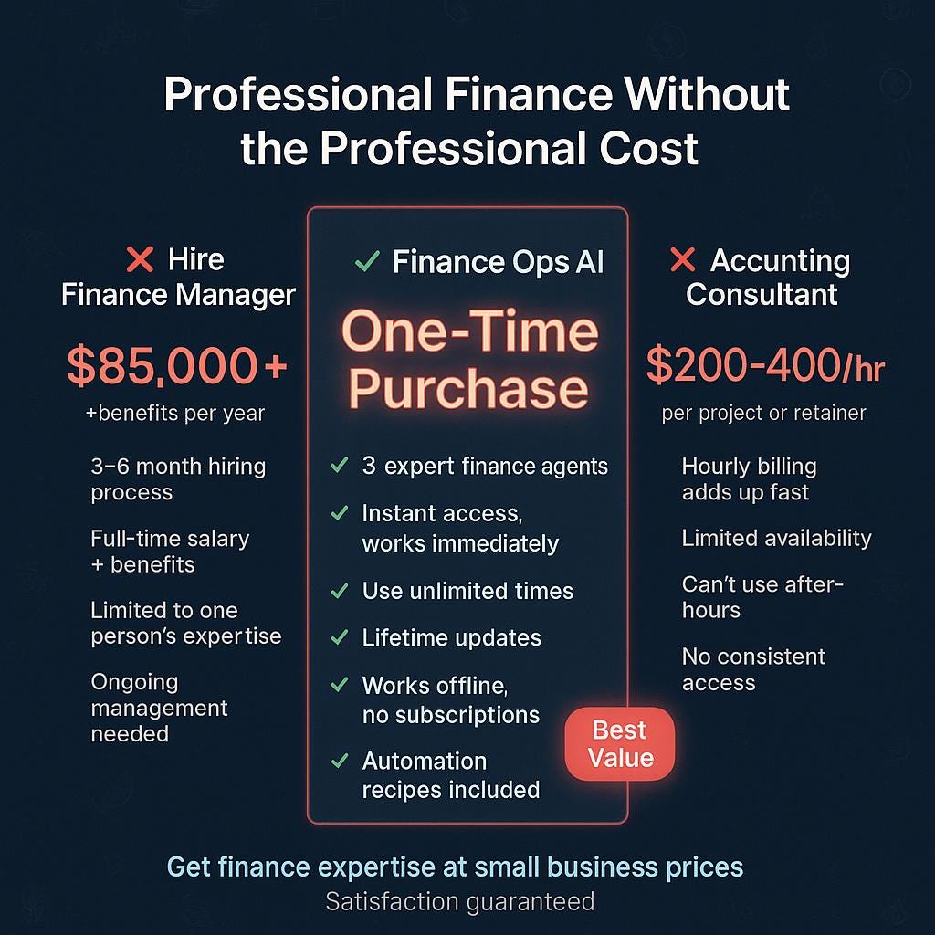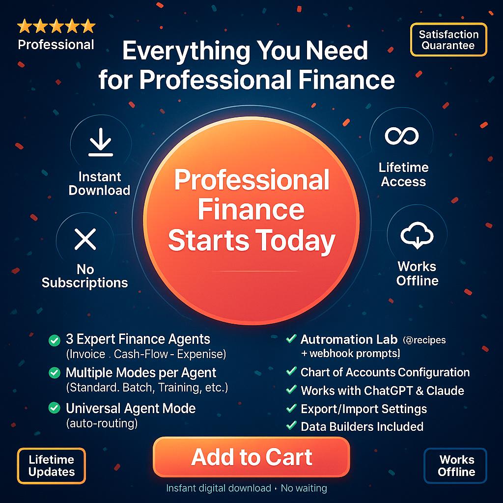 This is an educational tool and prompt template system, not professional financial, accounting, tax, or legal advice. Requires a separate ChatGPT (Plus/Team/Enterprise) or Claude subscription to use the AI agents. All outputs should be reviewed by qualified professionals before use in business operations. You are responsible for ensuring compliance with applicable regulations. No warranties expressed or implied. Results may vary.