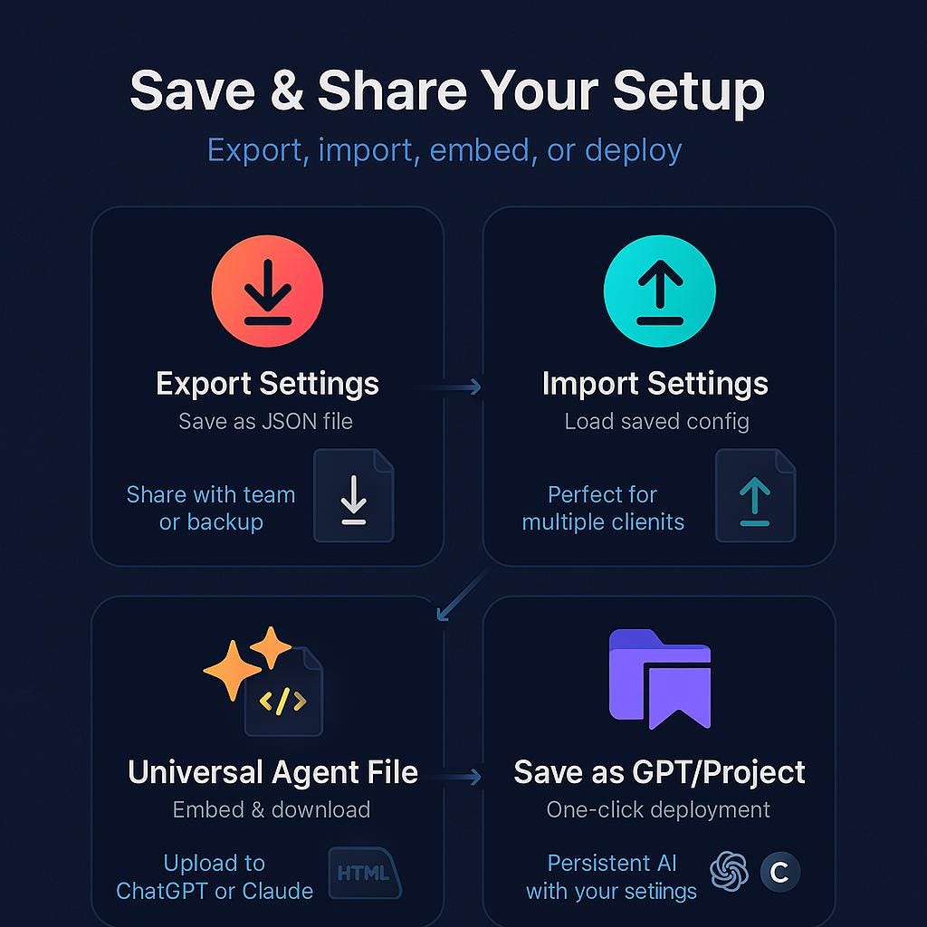 A: The HTML app works completely offline once downloaded. Your settings, prompts, and data entry helpers all work in your browser without internet. To actually USE the AI agents, you'll need internet to access ChatGPT or Claude.