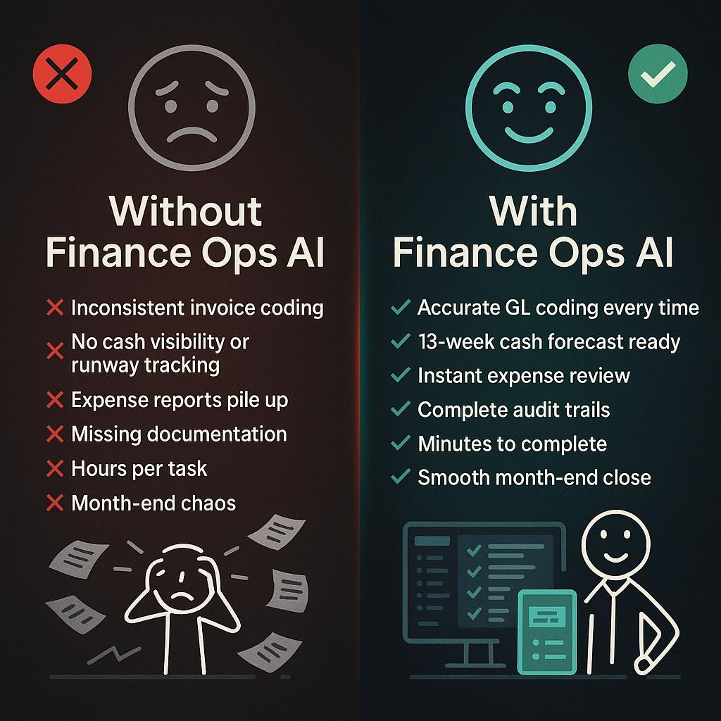 ✅ Finance Ops AI: "Code this invoice" → Returns proper GL journal entry with DR/CR, approval workflow, audit notes, payment recommendations