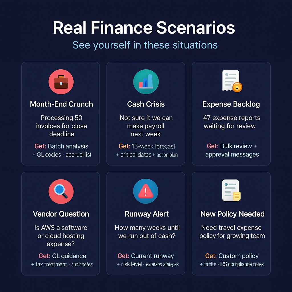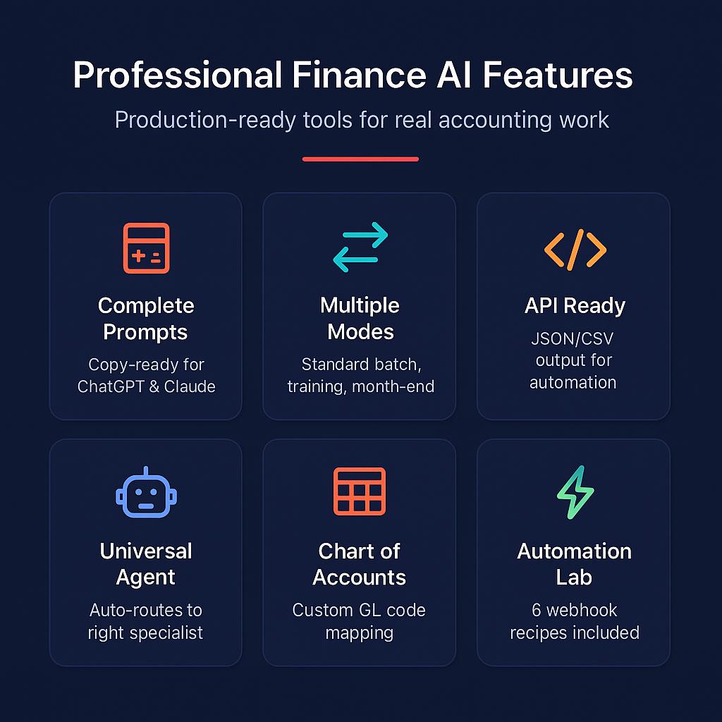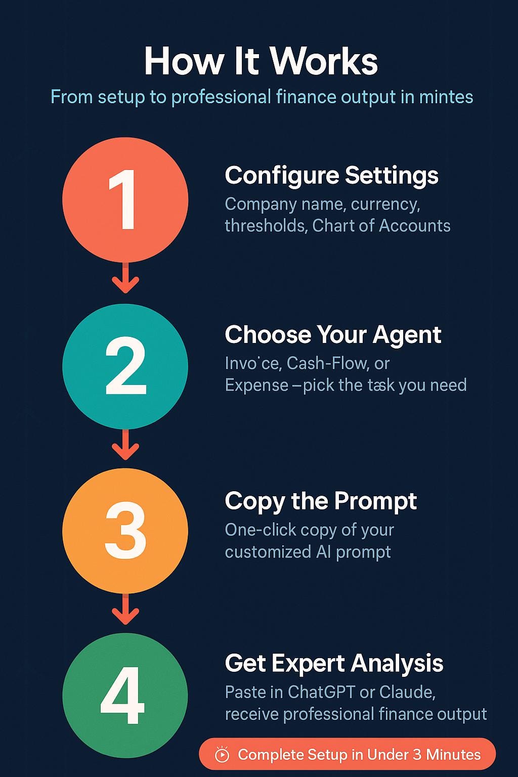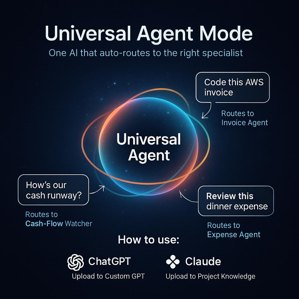 This isn't a PDF with copy-paste prompts. It's a fully interactive web application that runs in your browser, customizes to your company, and includes a breakthrough "Universal Agent" feature that automatically detects which expert you need - invoice processing, cash management, or expense review.