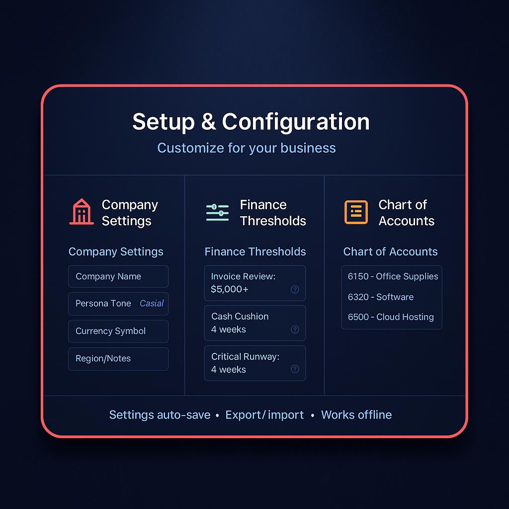 A: Yes! The setup wizard guides you through entering your company name, expense limits, chart of accounts, currency, and tone preferences. These settings update all three agents automatically and can be exported/imported for team sharing.