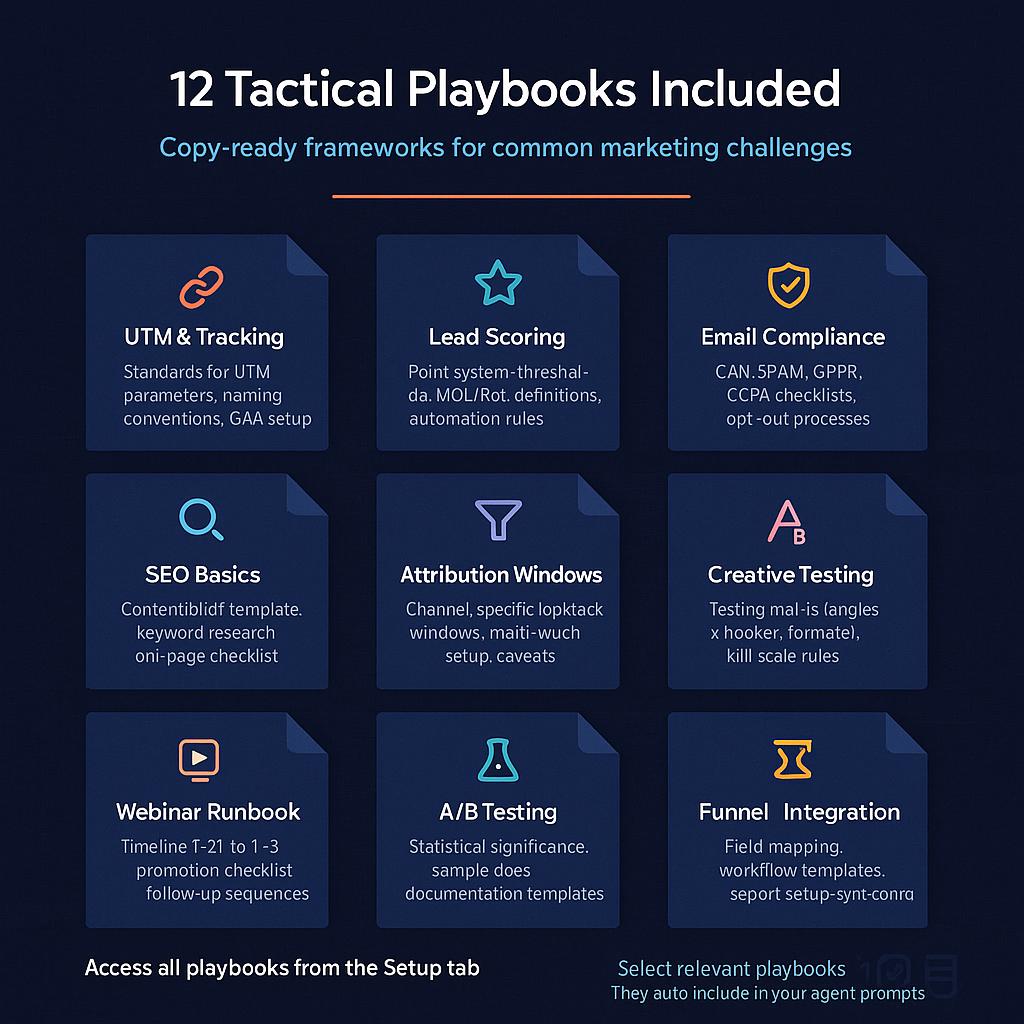 ✅ 12 Tactical Playbooks - UTM standards, lead scoring, creative testing, SEO briefs - Proven frameworks built in