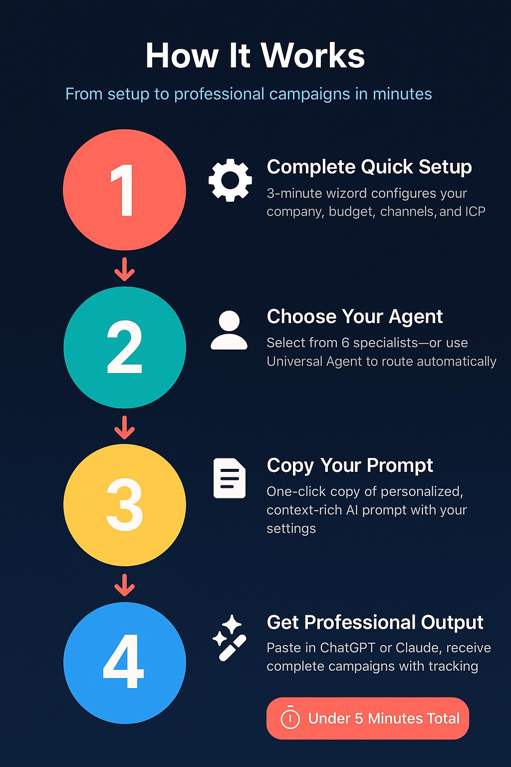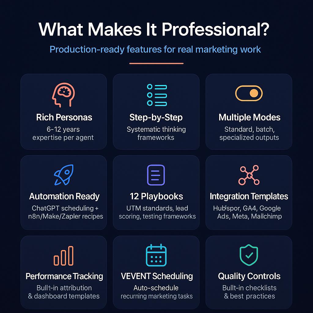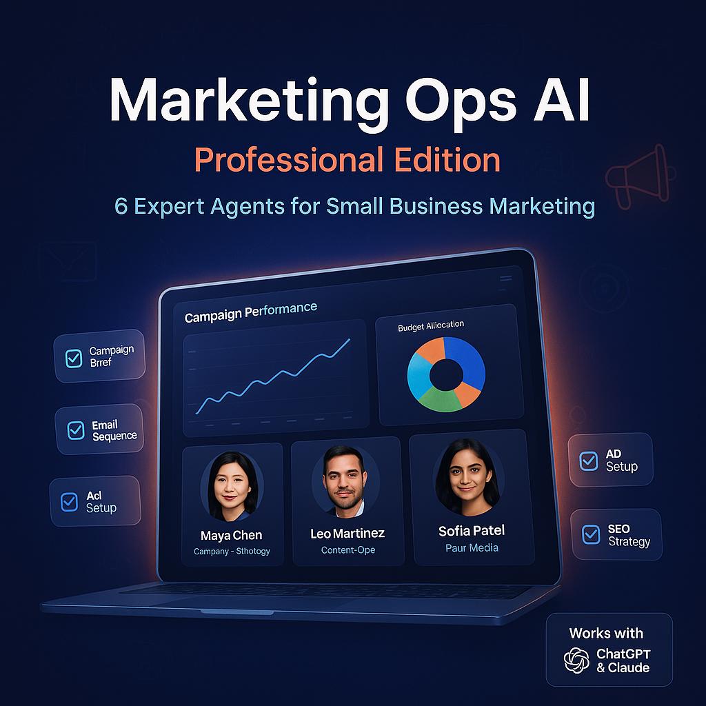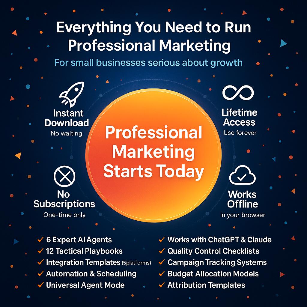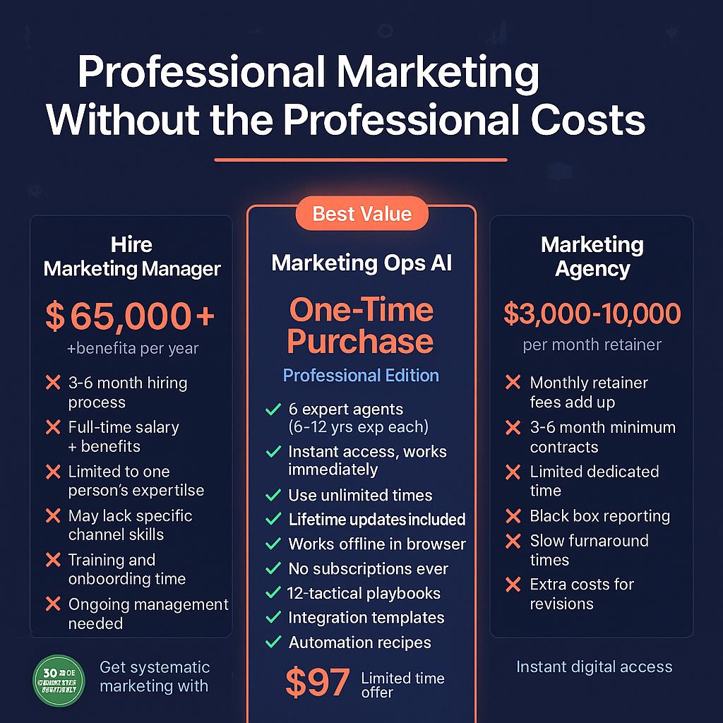 Marketing Ops AI Professional Edition gives you 6 specialized marketing agents with proven frameworks, paste-ready templates, and built-in tracking systems—so you know exactly which channels drive revenue.