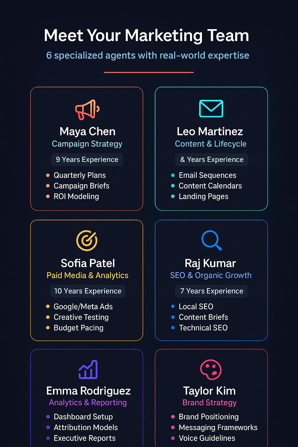 ✅ 6 Specialized Marketing Agents - Campaign, Content, Paid Ads, SEO, Analytics, Brand - Routes to the right expert automatically