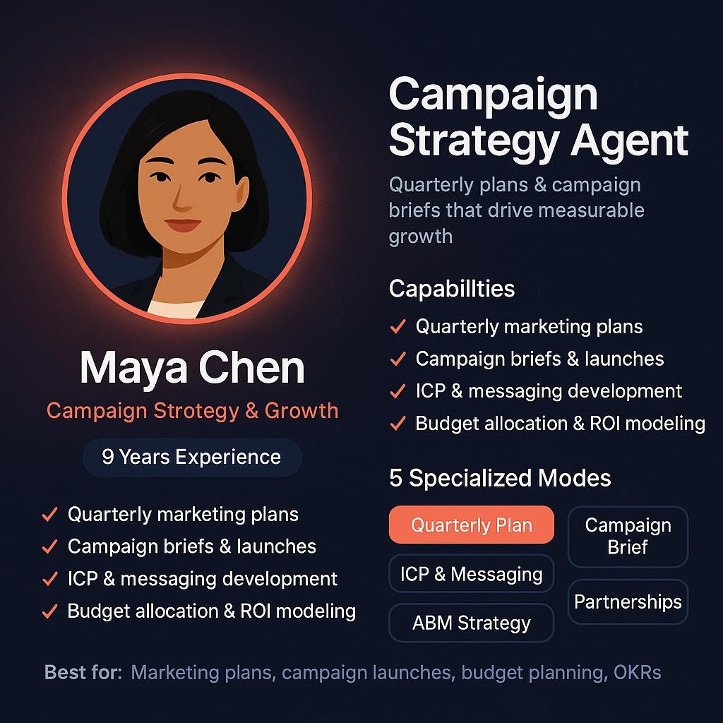 Maya Chen (Campaign Strategy): Quarterly plans, ICP, OKRs, ROI models