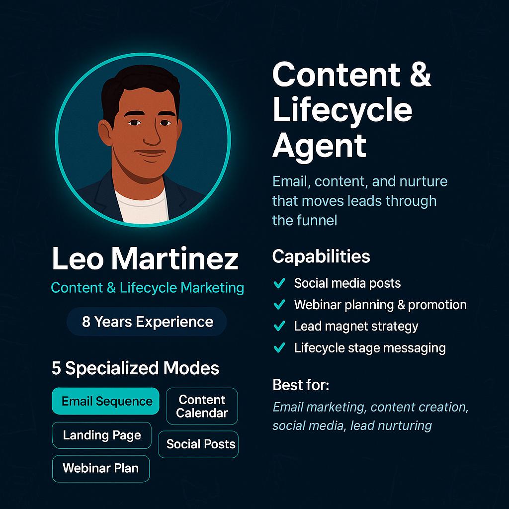 Leo Martinez (Content & Lifecycle): Email sequences, content calendars, landing pages