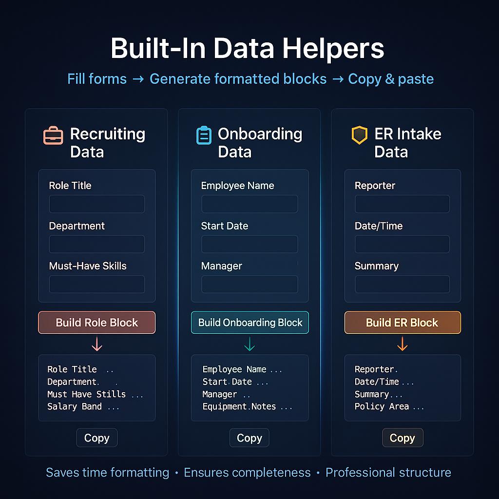 β¨ Data Helpers β Fill in recruiting, onboarding, or ER details; get formatted blocks