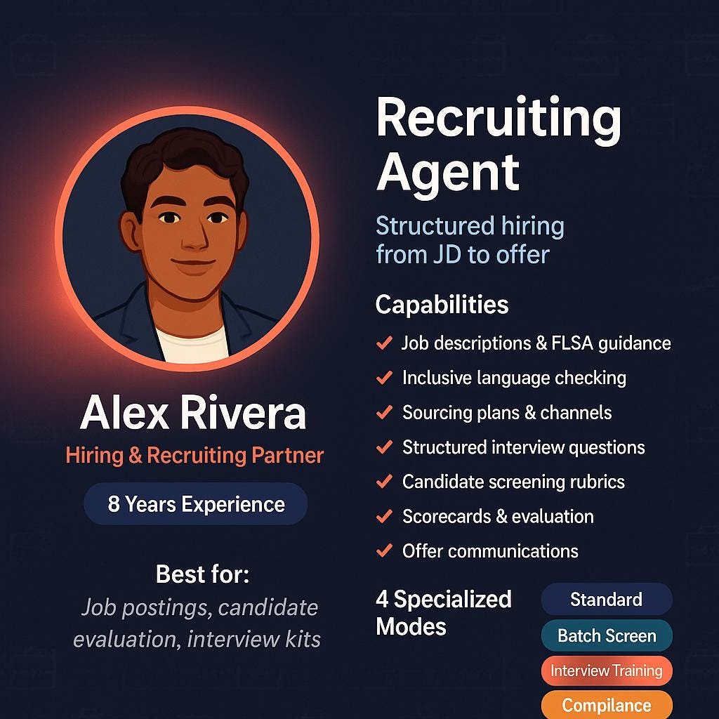 Alex Rivera (Recruiting) β 8 years building structured interviews & inclusive job descriptions