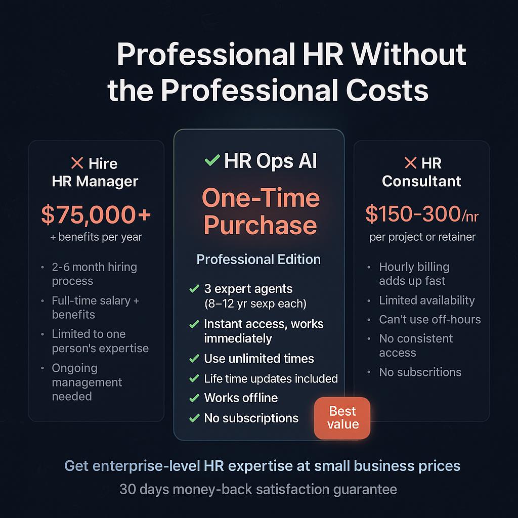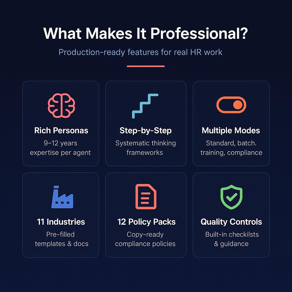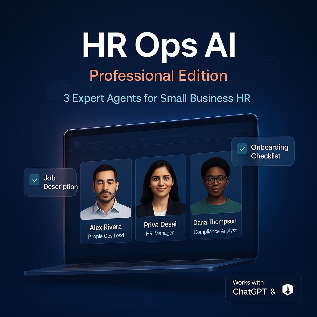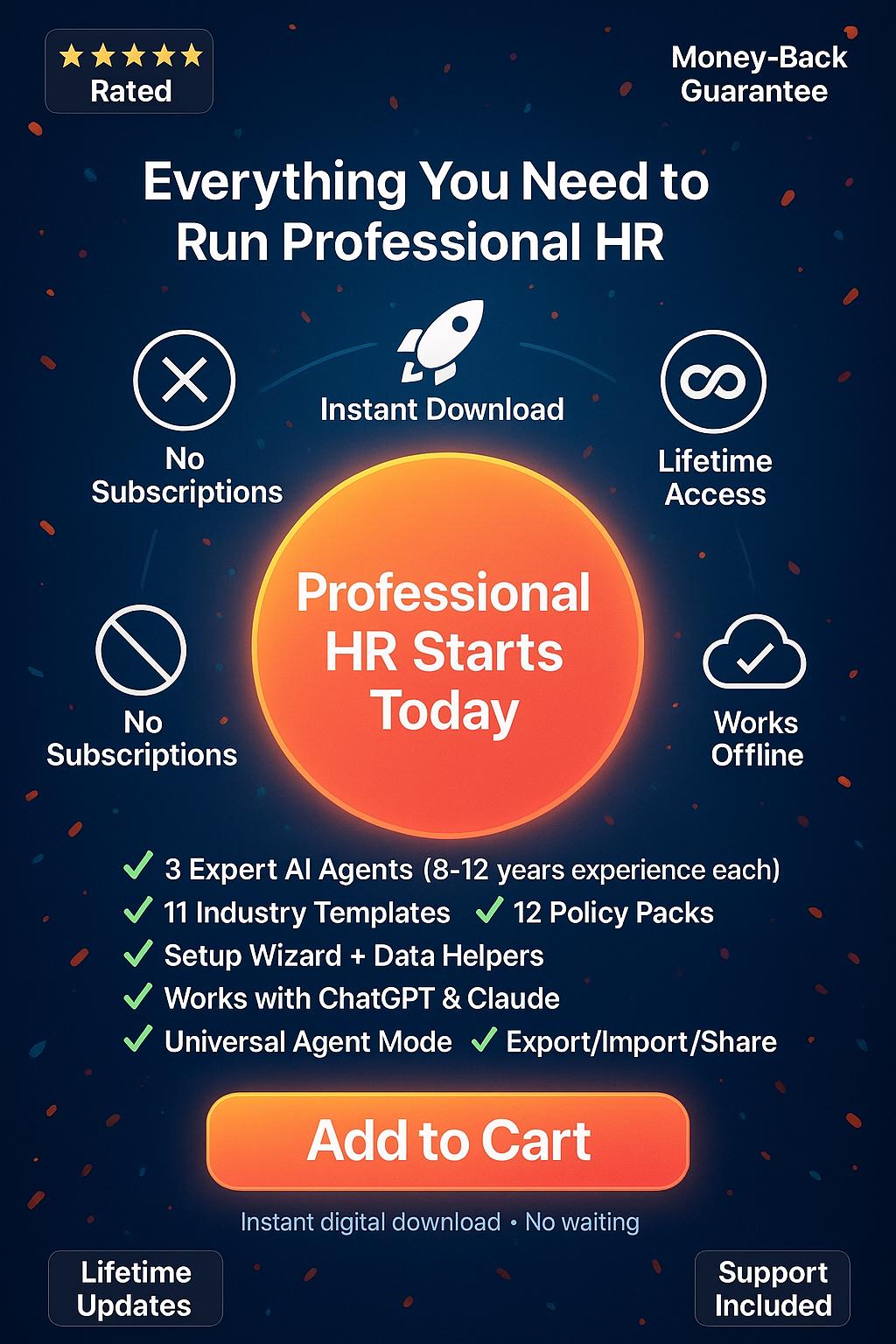 Stop struggling with inconsistent hiring, chaotic onboarding, and reactive employee relations. This Professional Edition delivers three specialized HR AI agents with 8-12 years of expertise each β ready to deploy in ChatGPT, Claude, or as a Universal Agent.
