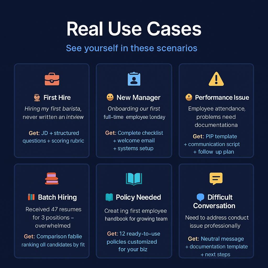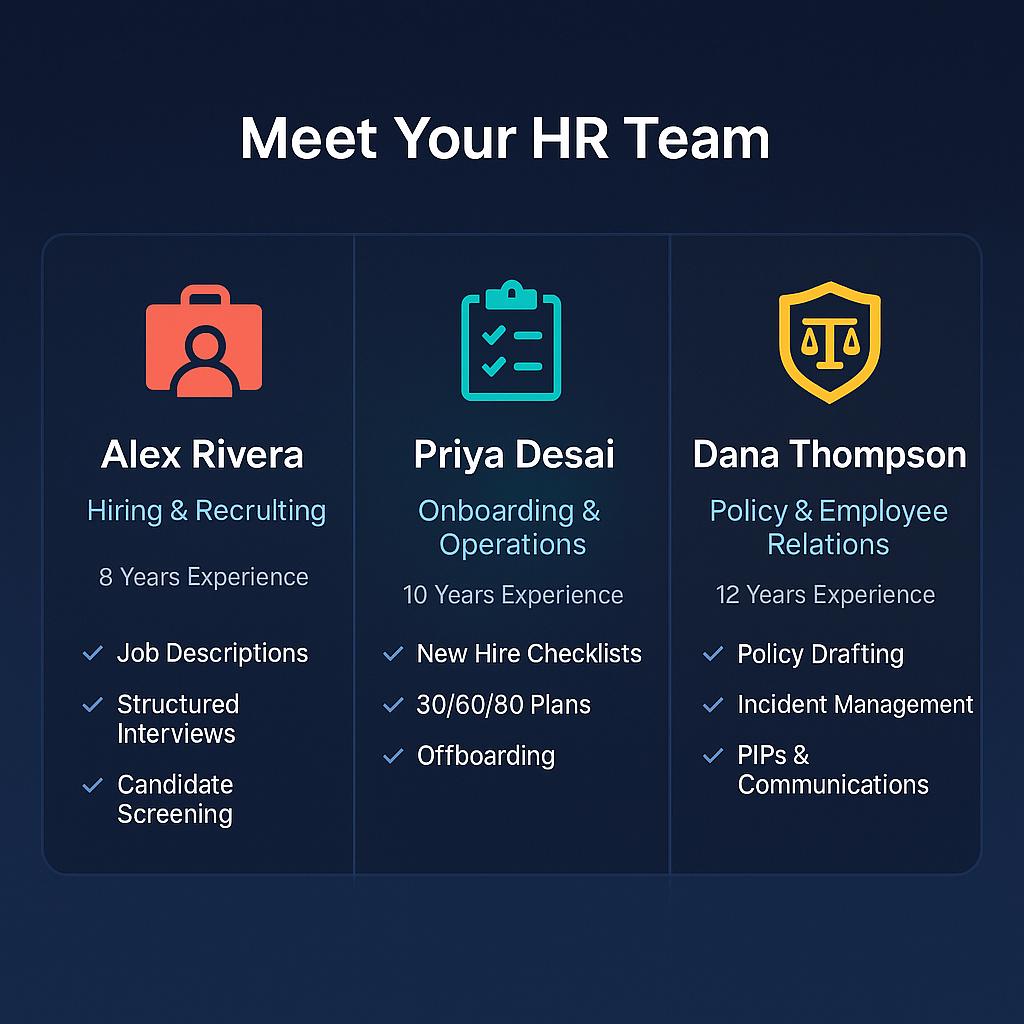 Stop reinventing the wheel every time you hire, onboard, or handle an employee issue. Get 3 expert HR agents working for you today.