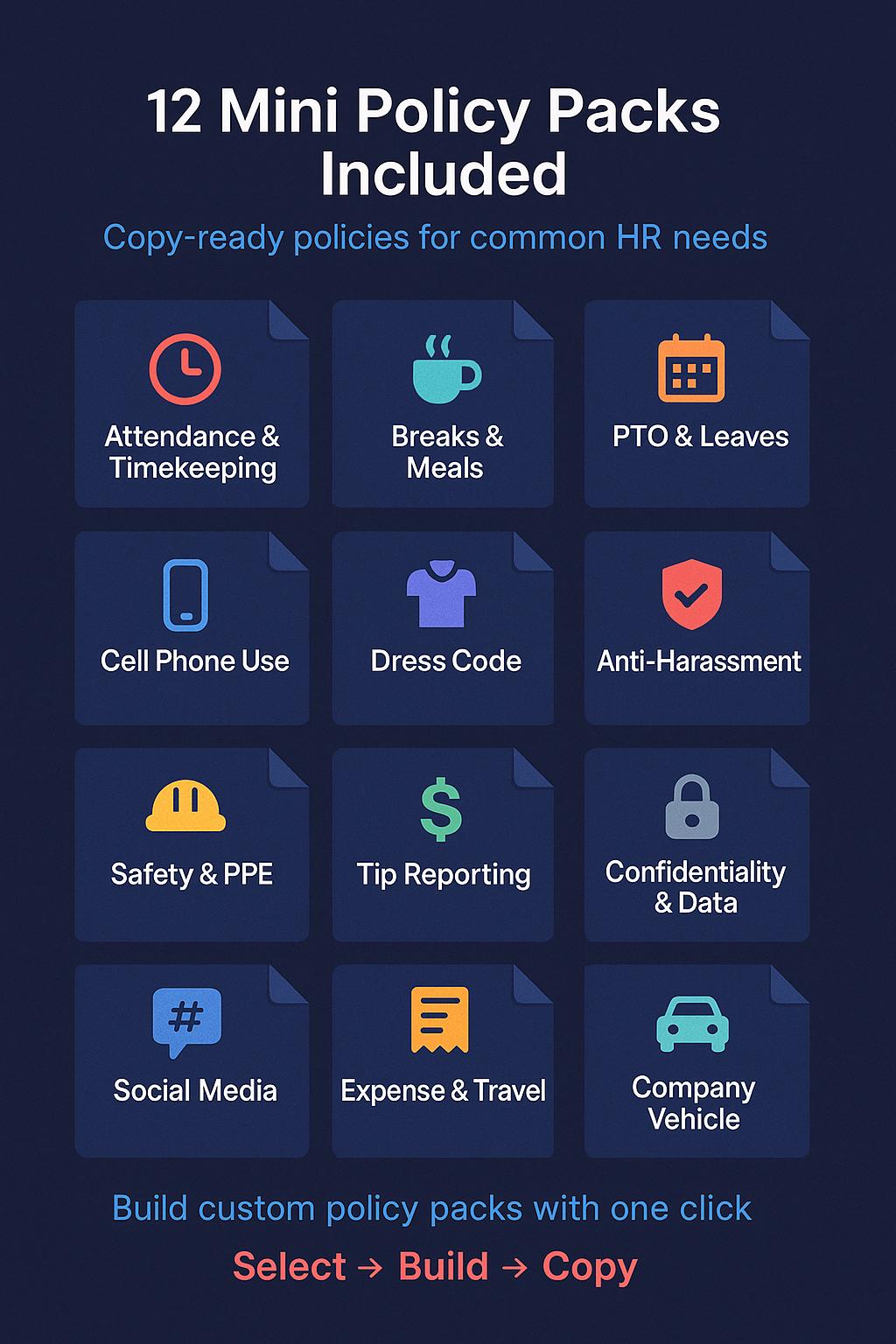 12 Mini Policy Packs β Copy-ready policies for attendance, breaks, PTO, safety, confidentiality, and more