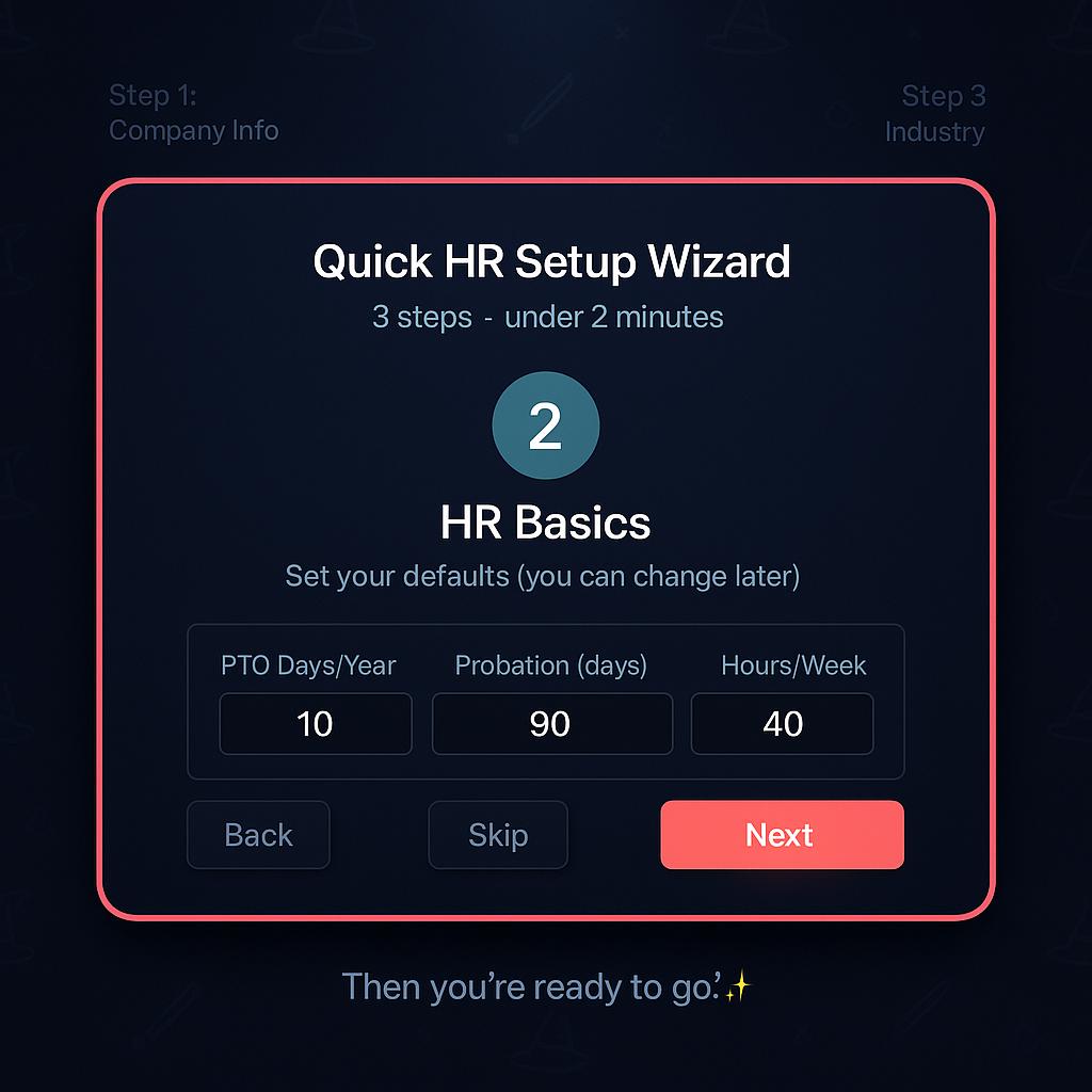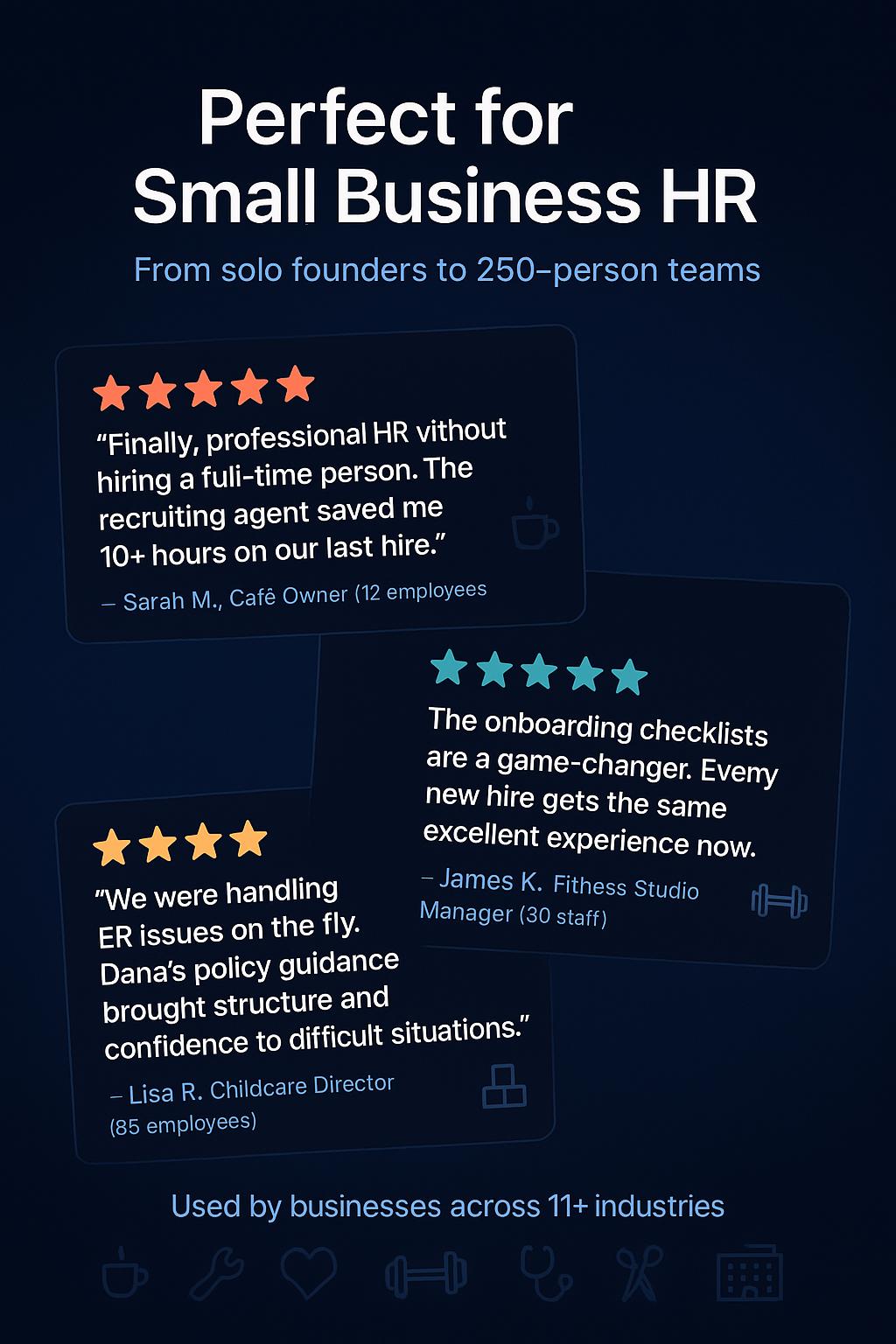 Perfect for small business owners, HR teams of 1-3, startups, and growing companies (5-250 employees) who need professional HR systems without enterprise costs.