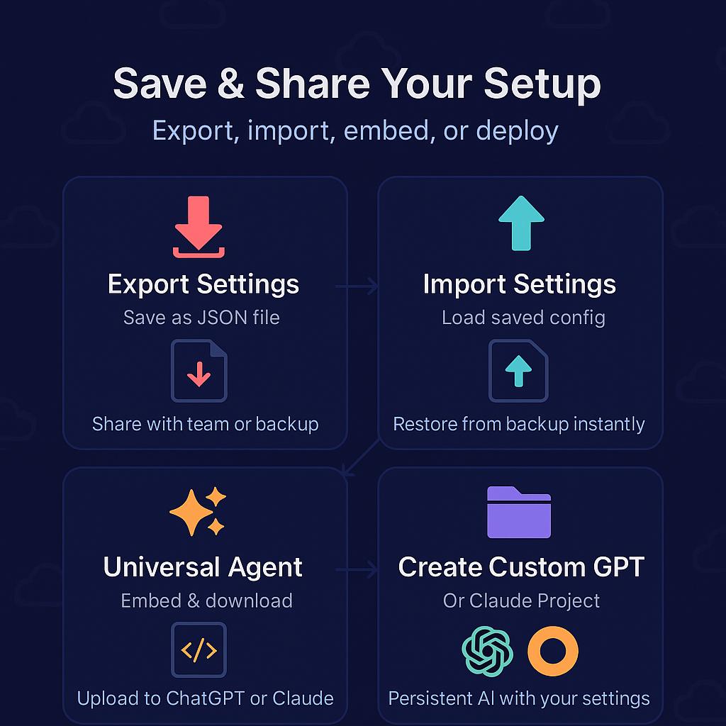 A: Yes! Export your settings as JSON and share with your team, or use Universal Agent mode in a shared ChatGPT/Claude workspace.