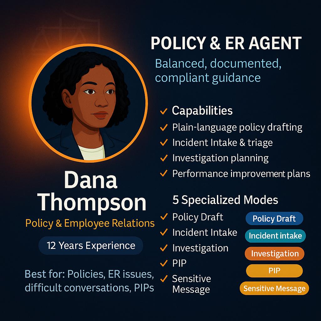 Dana Thompson (Policy & ER) β 12 years navigating sensitive situations with balanced, documented steps