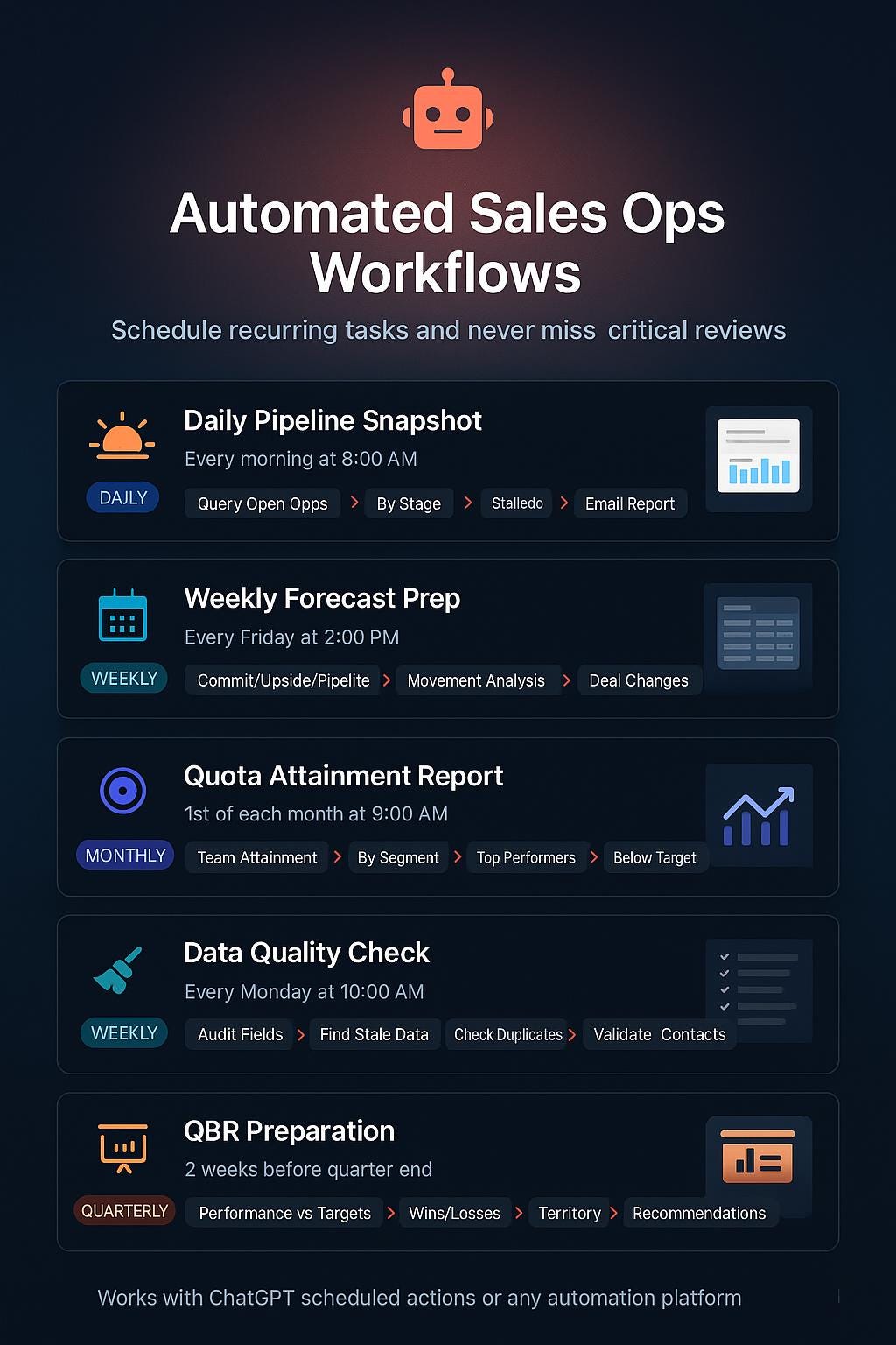 ✅ 15+ Automation Recipes - Pipeline snapshots, forecast prep, quota reports, data audits