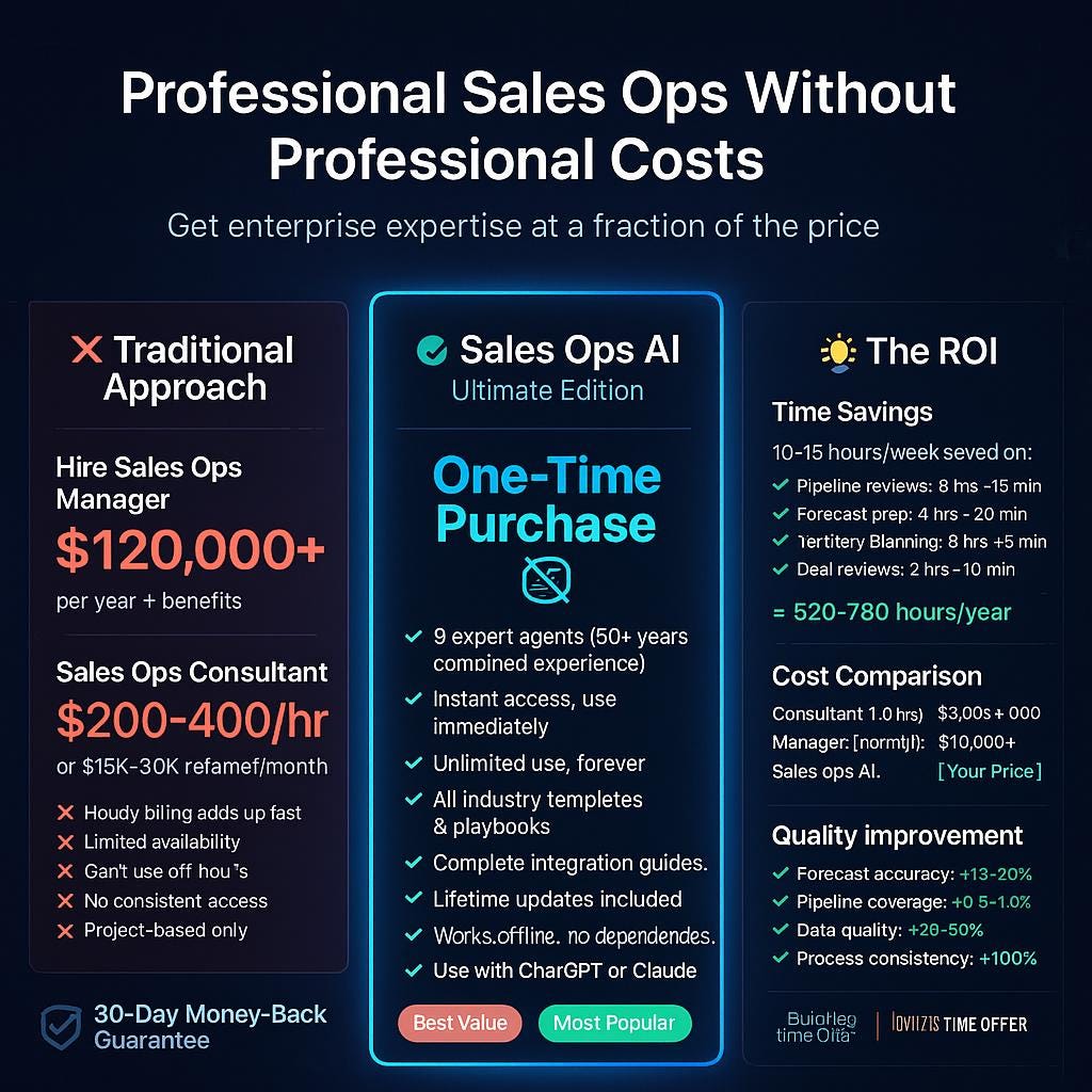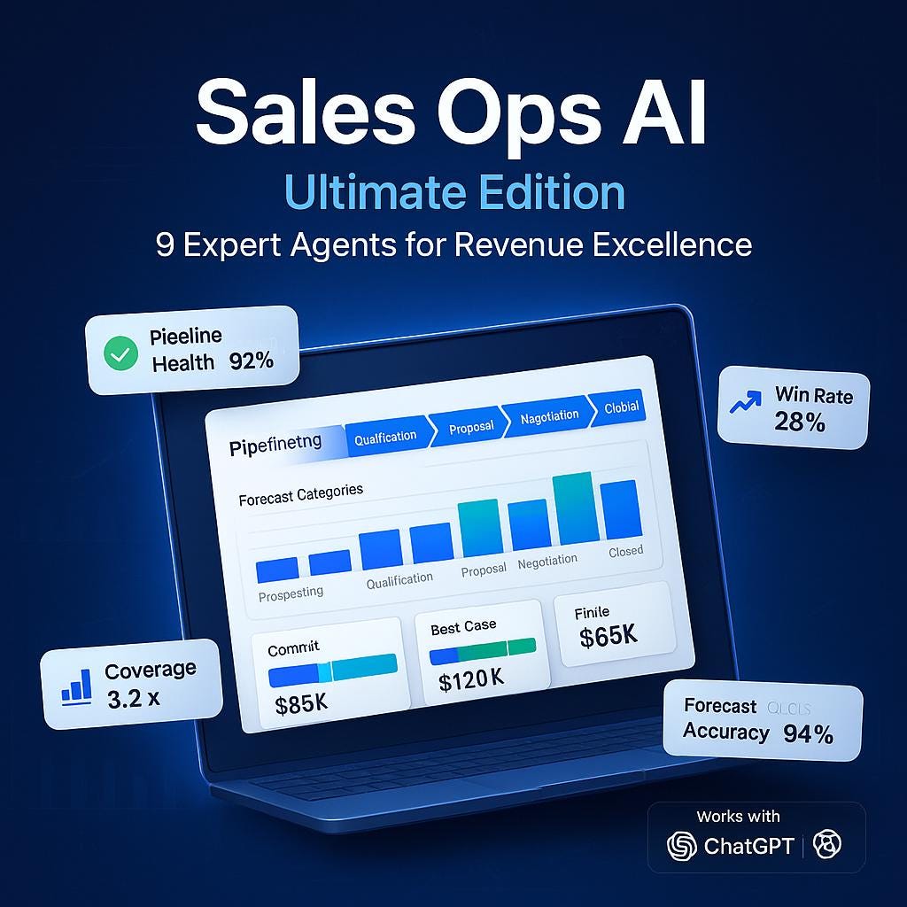 Stop reinventing the wheel every time you need to review pipeline, plan territories, or design compensation plans. This professional-grade AI toolkit puts 10+ years of sales ops expertise at your fingertips with ready-to-use prompts, frameworks, and automation recipes.