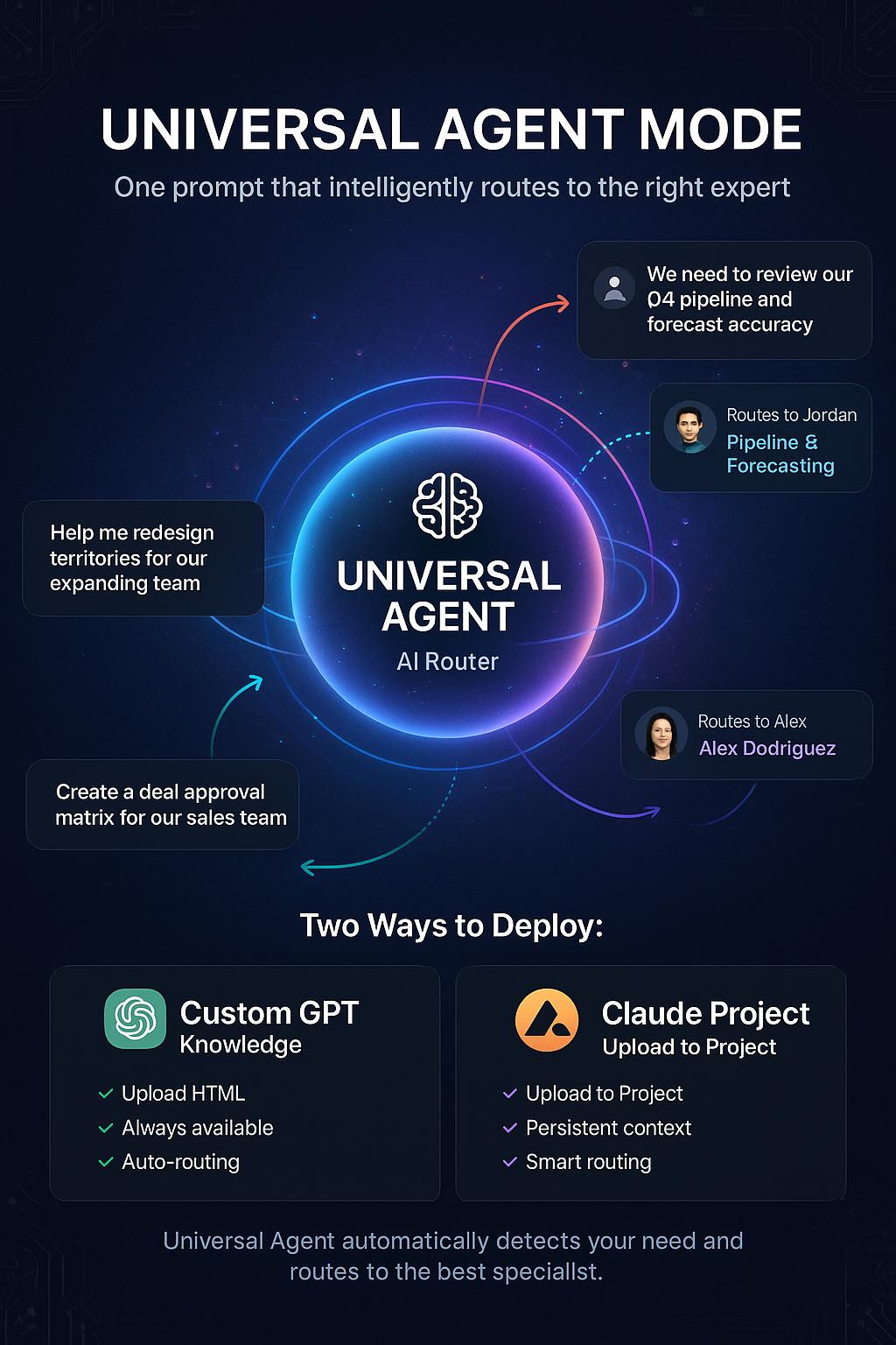 ✅ Universal Agent Mode - One-click deployment to ChatGPT Custom GPTs or Claude Projects