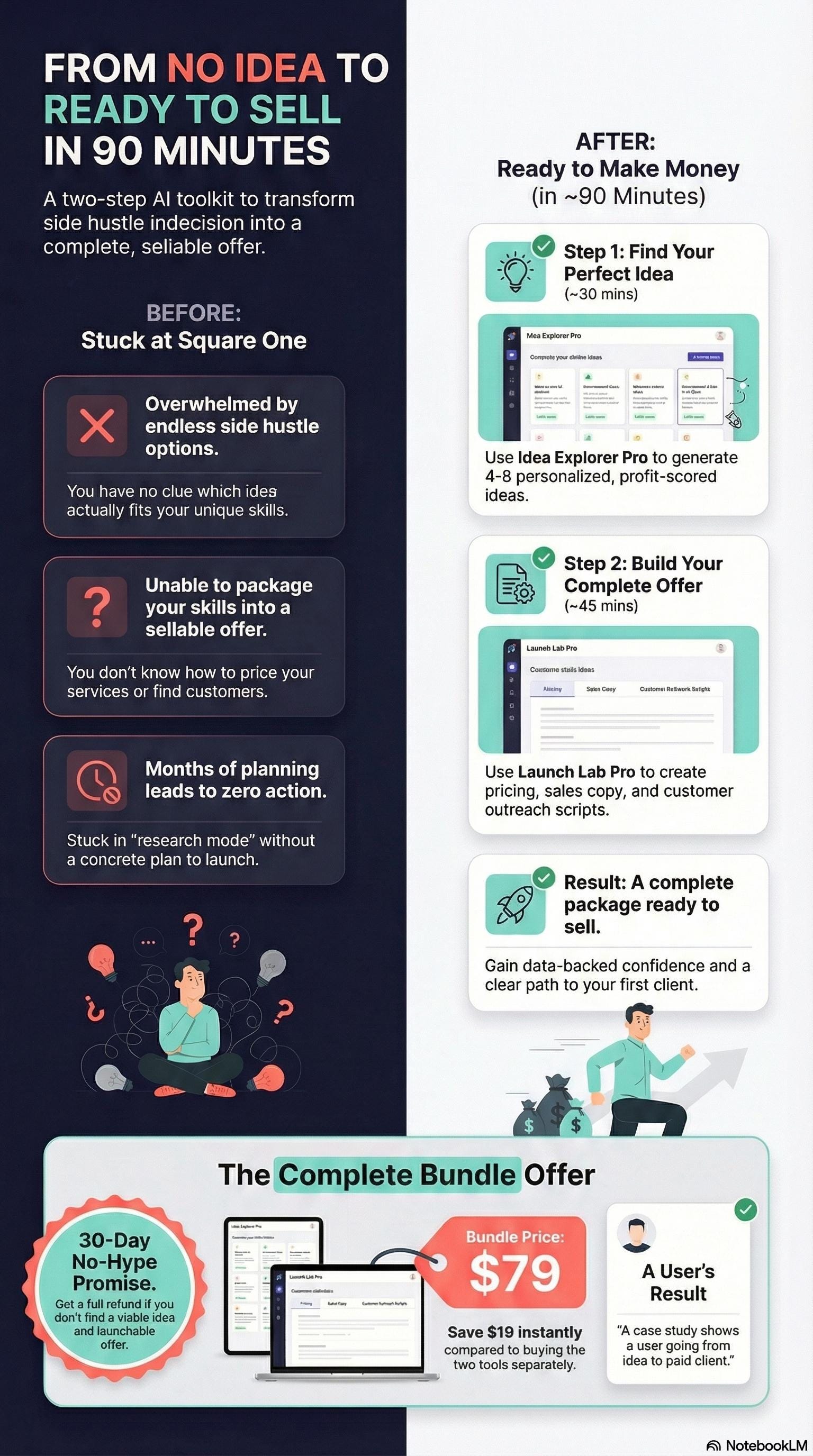 Tools (Idea Explorer, Launch Lab): A complete, validated idea or sellable offer in 30-90 minutes.
