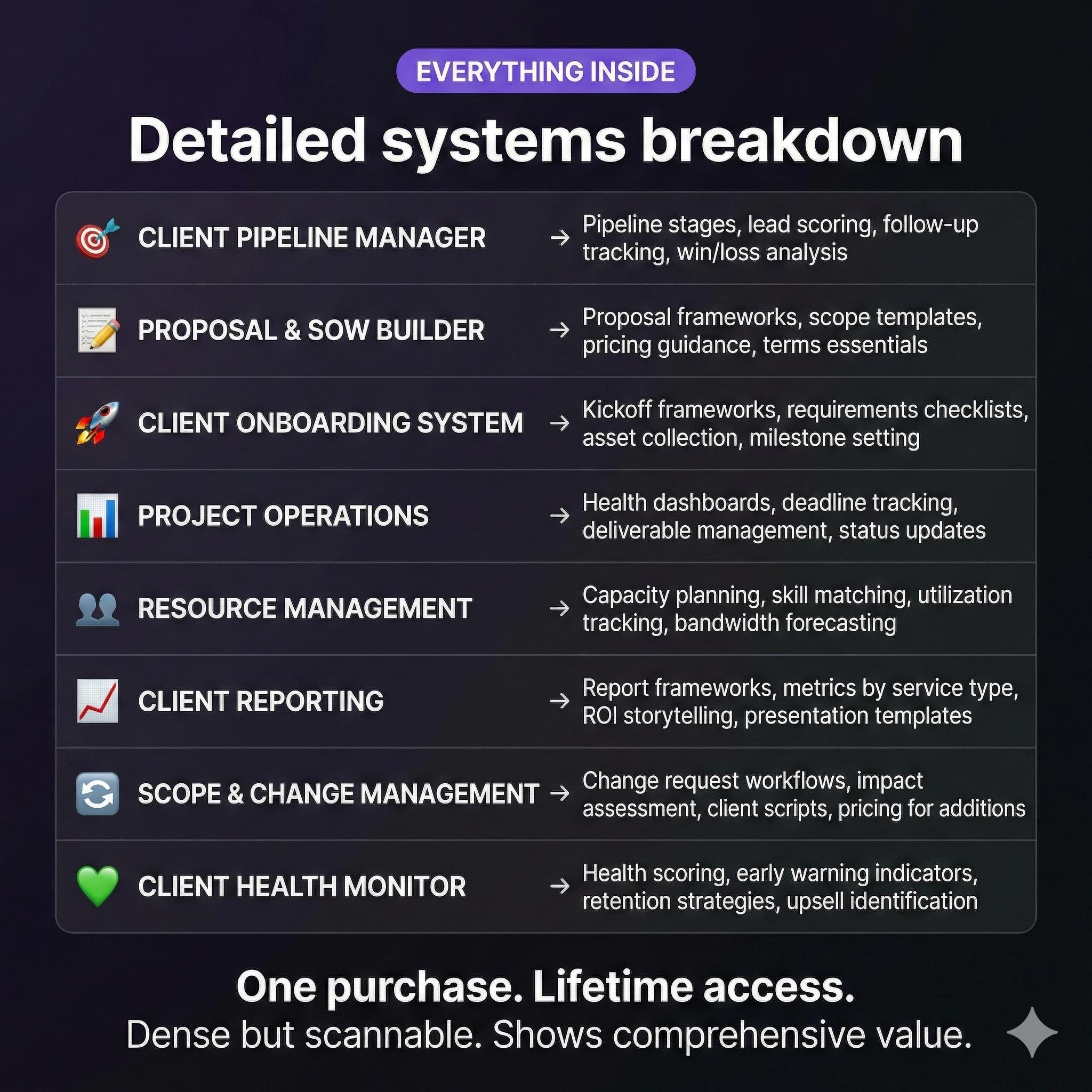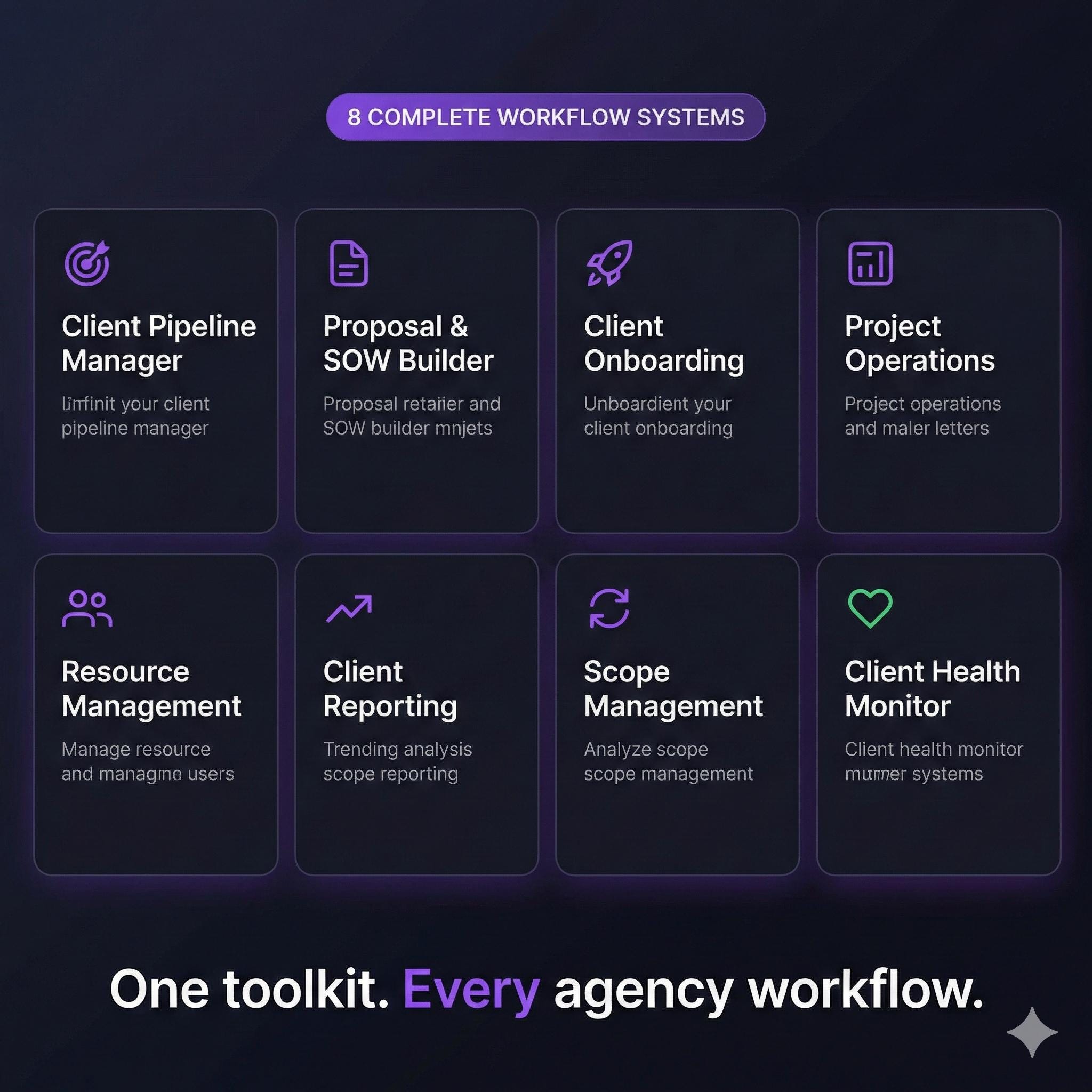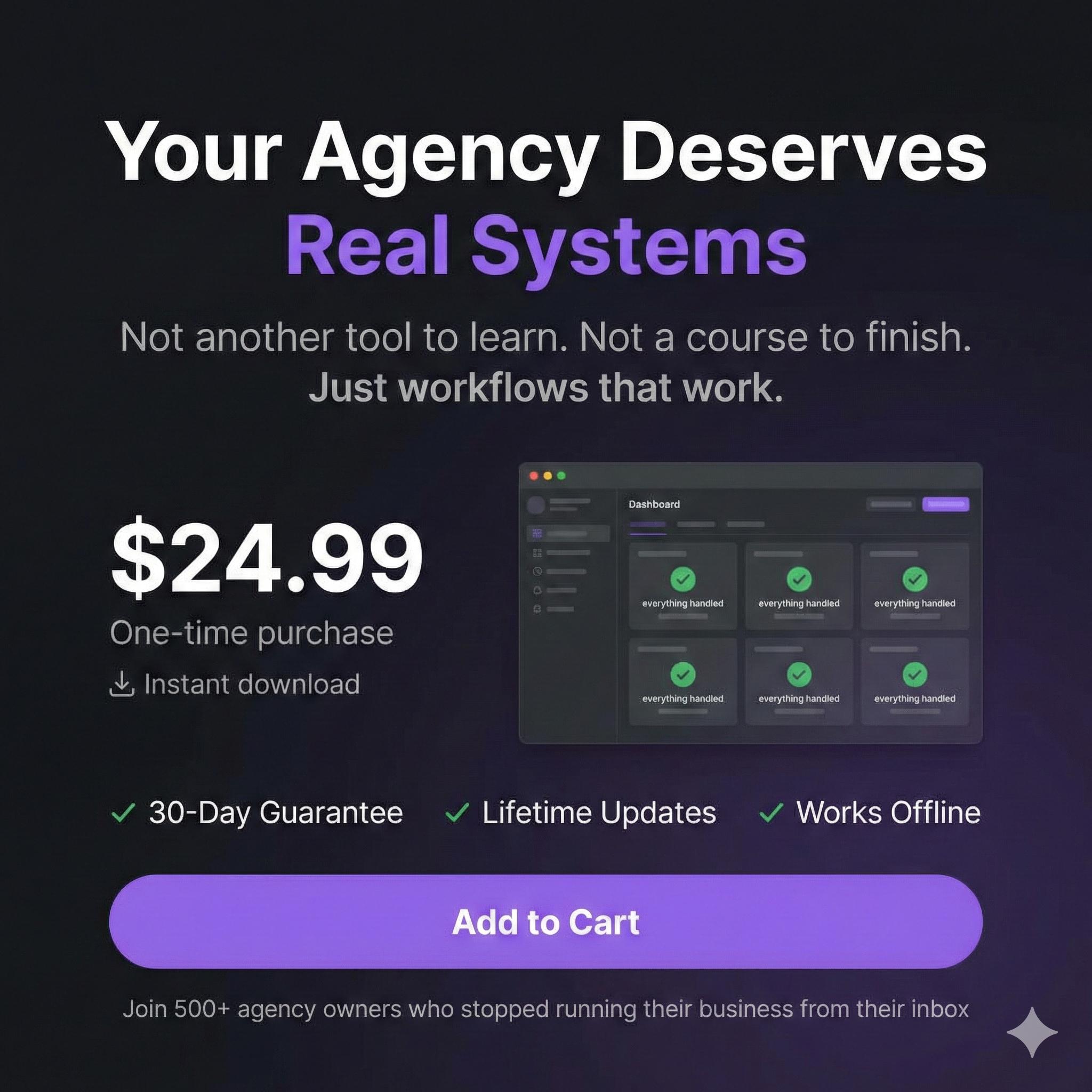 A: Those tools track tasks. This gives you SYSTEMS β€” the operational frameworks, decision guides, and processes that determine HOW you run your agency. Use alongside your project management tools.