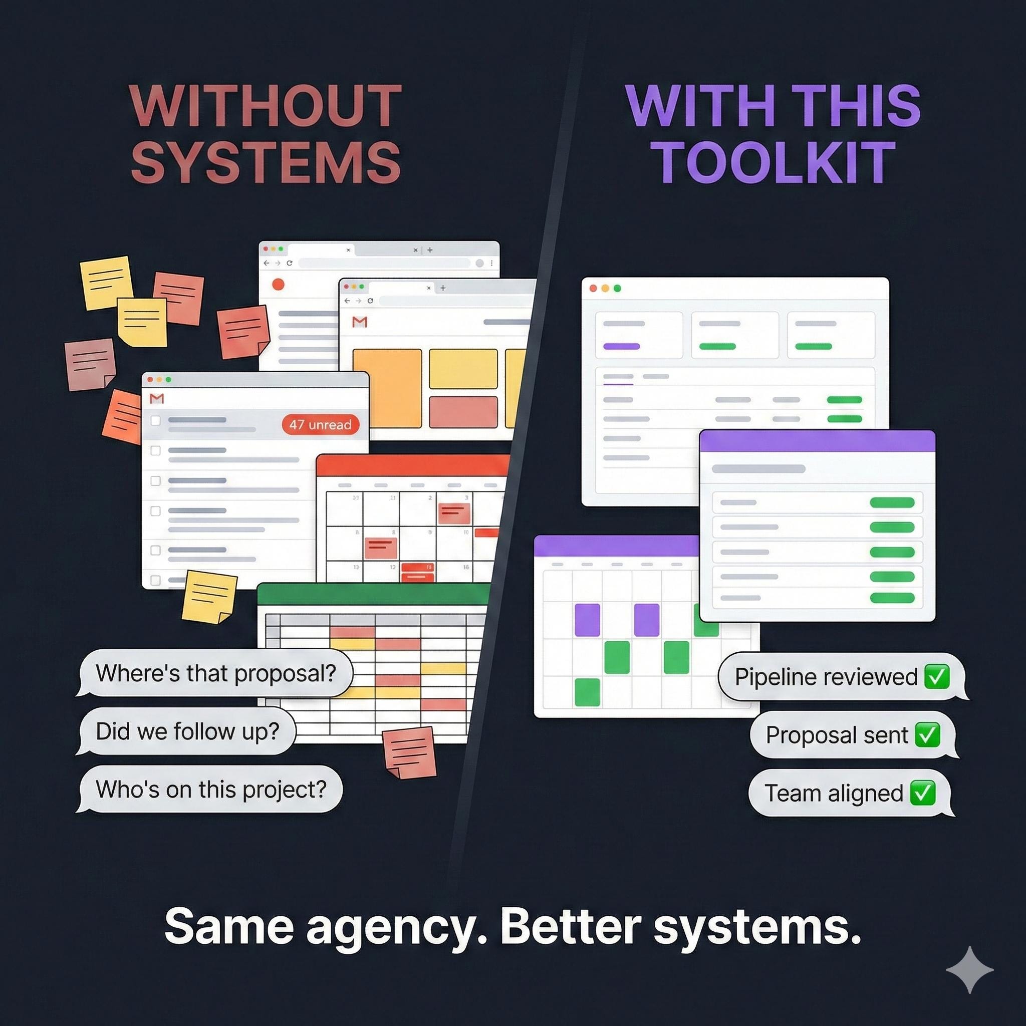 This won't magically double your revenue. It gives you SYSTEMS that make running your agency less chaotic, more professional, and actually scalable.