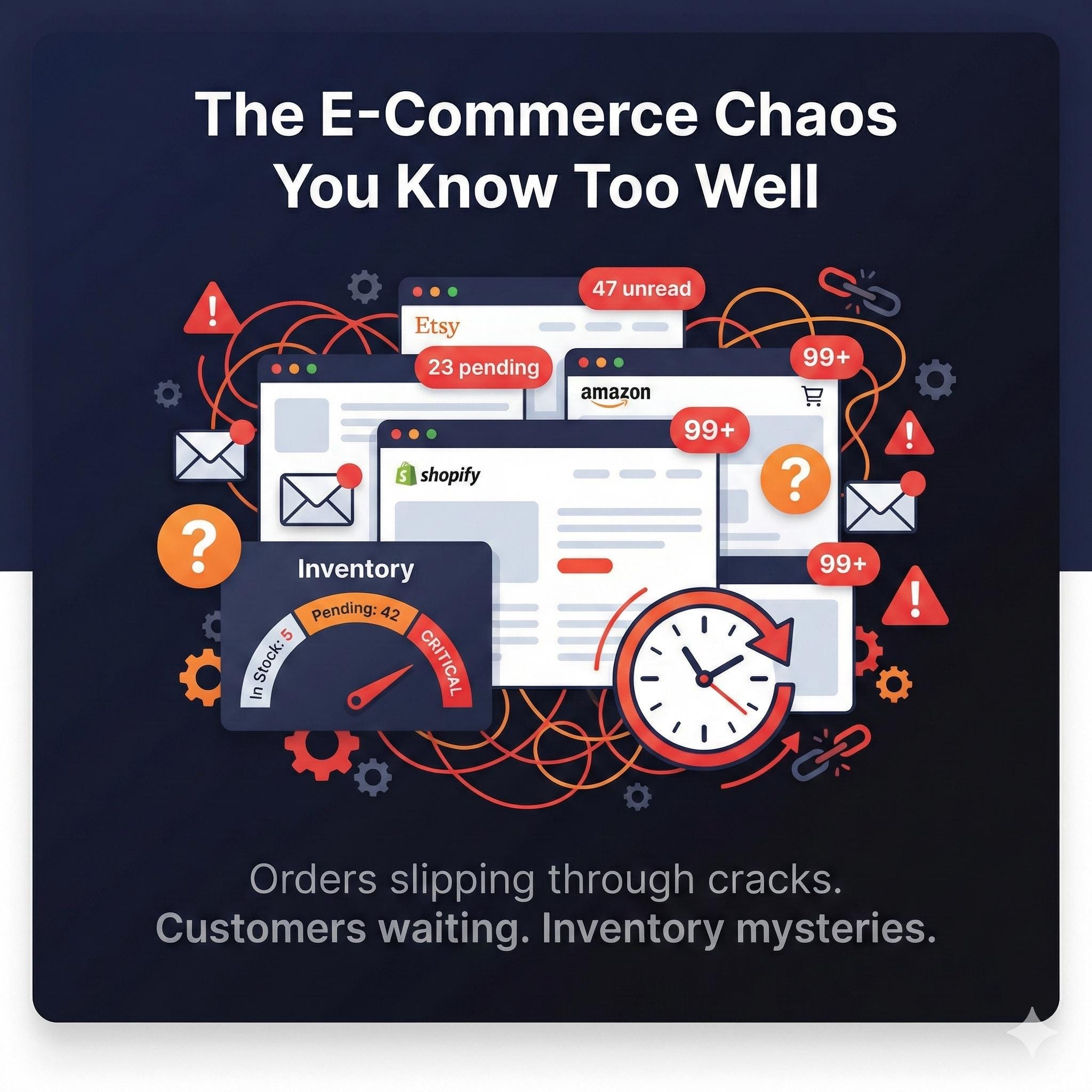 Orders coming in from three platforms. Customer emails piling up. Inventory counts that don't match reality. Returns you forgot to process.