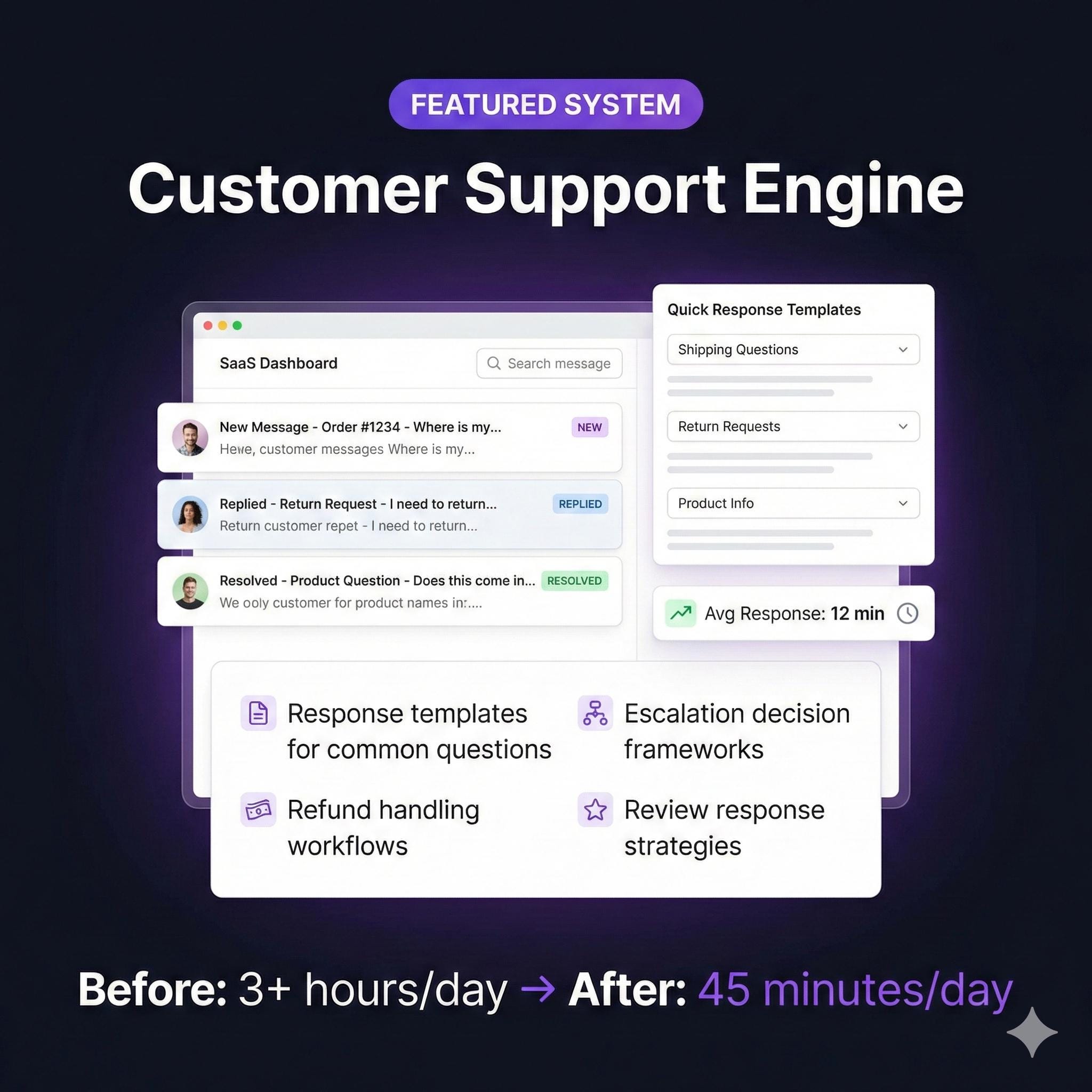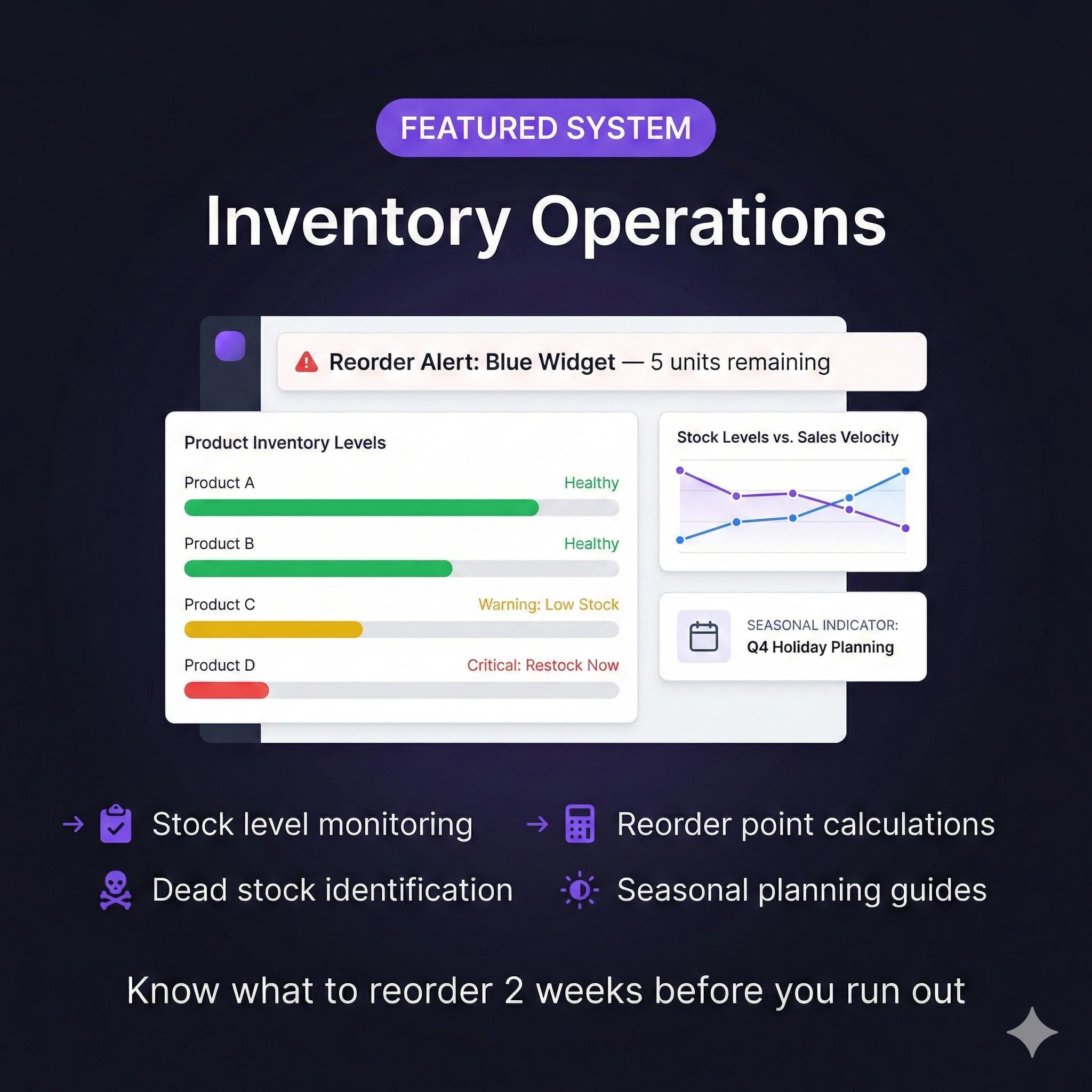 A: Those tools DO things (sync inventory, send emails). This gives you SYSTEMS β€” the decision frameworks, processes, and workflows that determine WHAT to do and WHEN. Use alongside your existing tools.