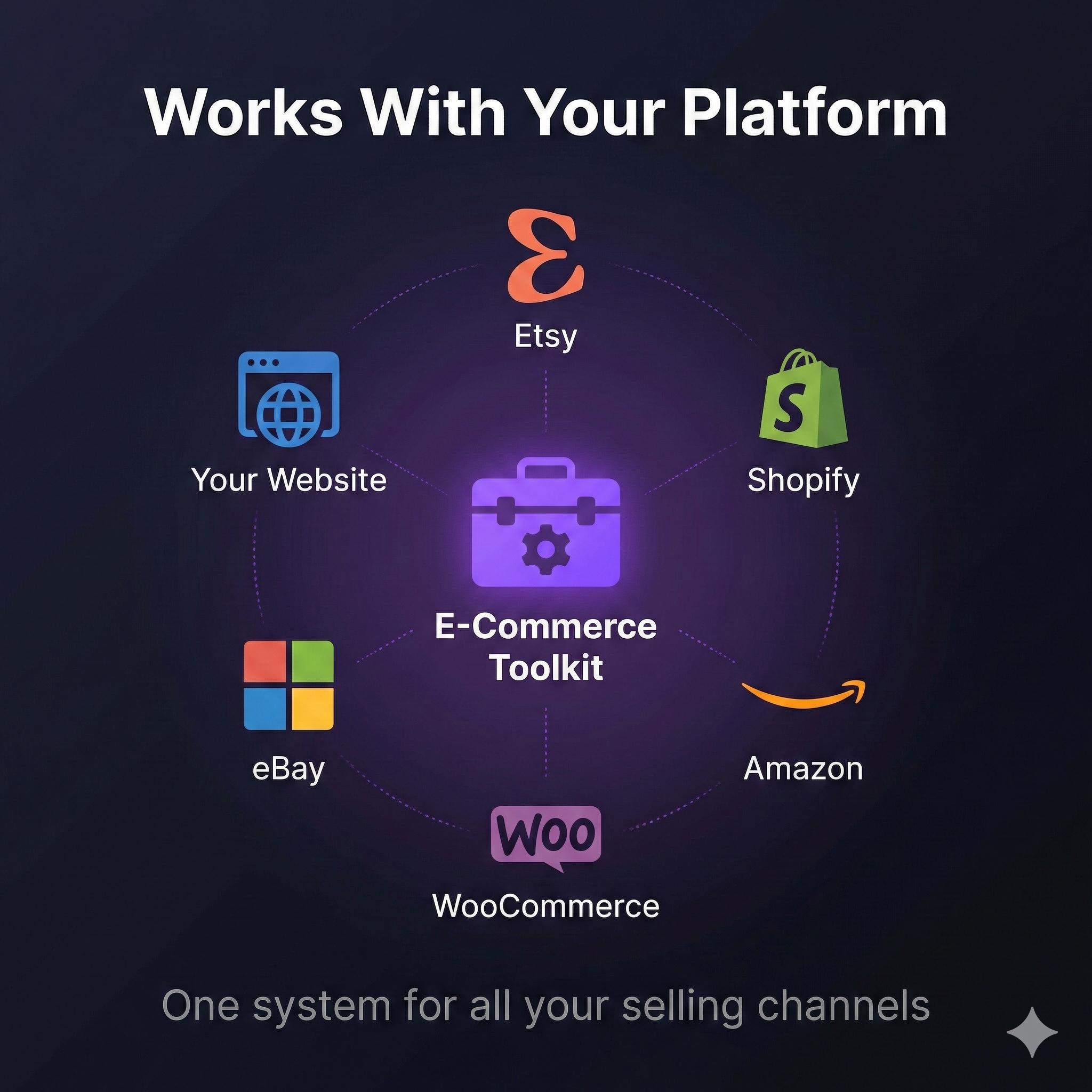 A: Etsy, Shopify, Amazon, WooCommerce, eBay, your own website β€” any e-commerce platform. You customize it to your setup during configuration.