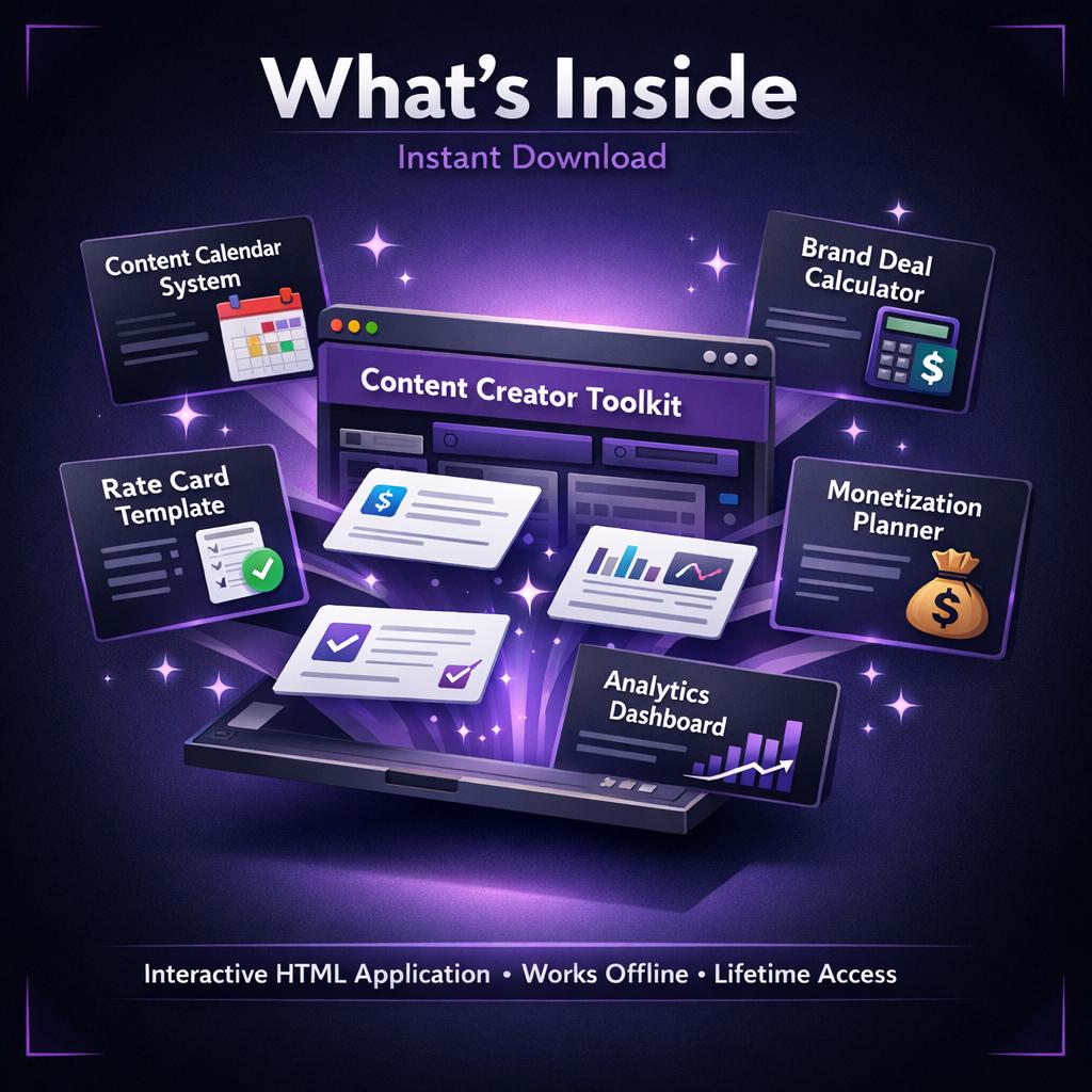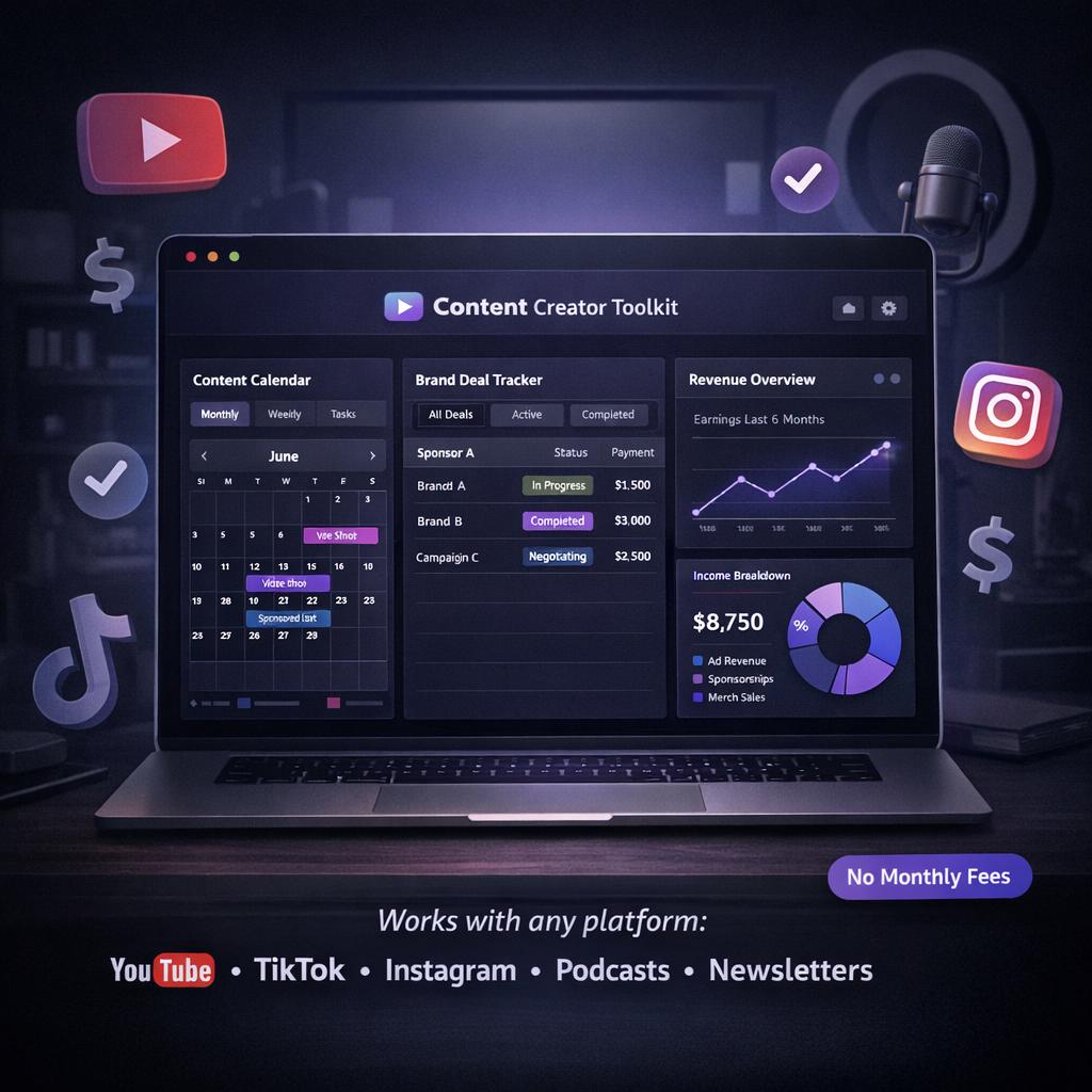 This isn't just a static template β€” it's an AI-powered business application. The toolkit uses artificial intelligence to help you brainstorm content ideas, calculate your true brand deal rates, plan monetization strategies, and batch-create content outlines. You get the strategic thinking of a creator business manager combined with AI that understands YOUR niche and YOUR audience. No prompt engineering required β€” just answer the guided questions and let the AI do the heavy lifting.