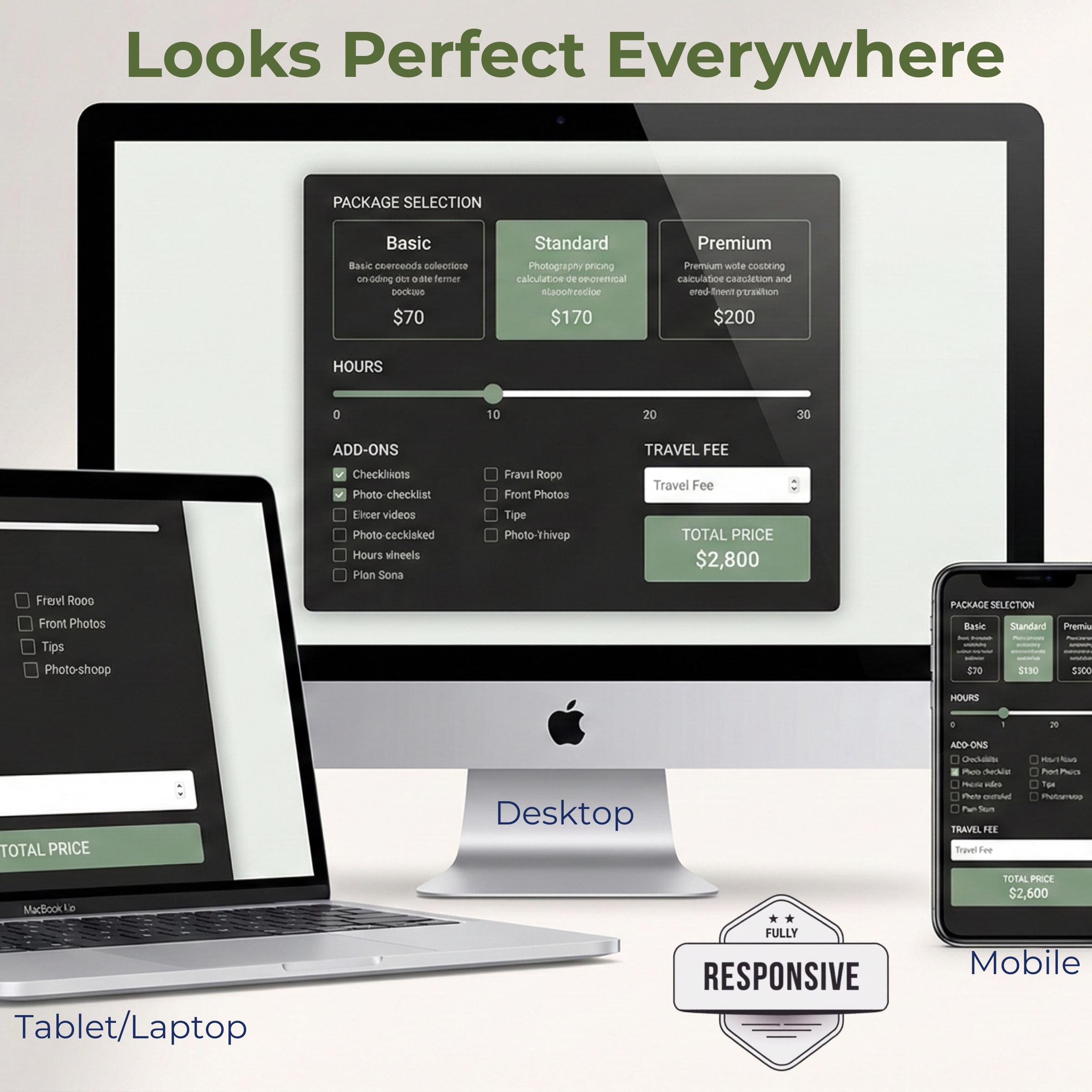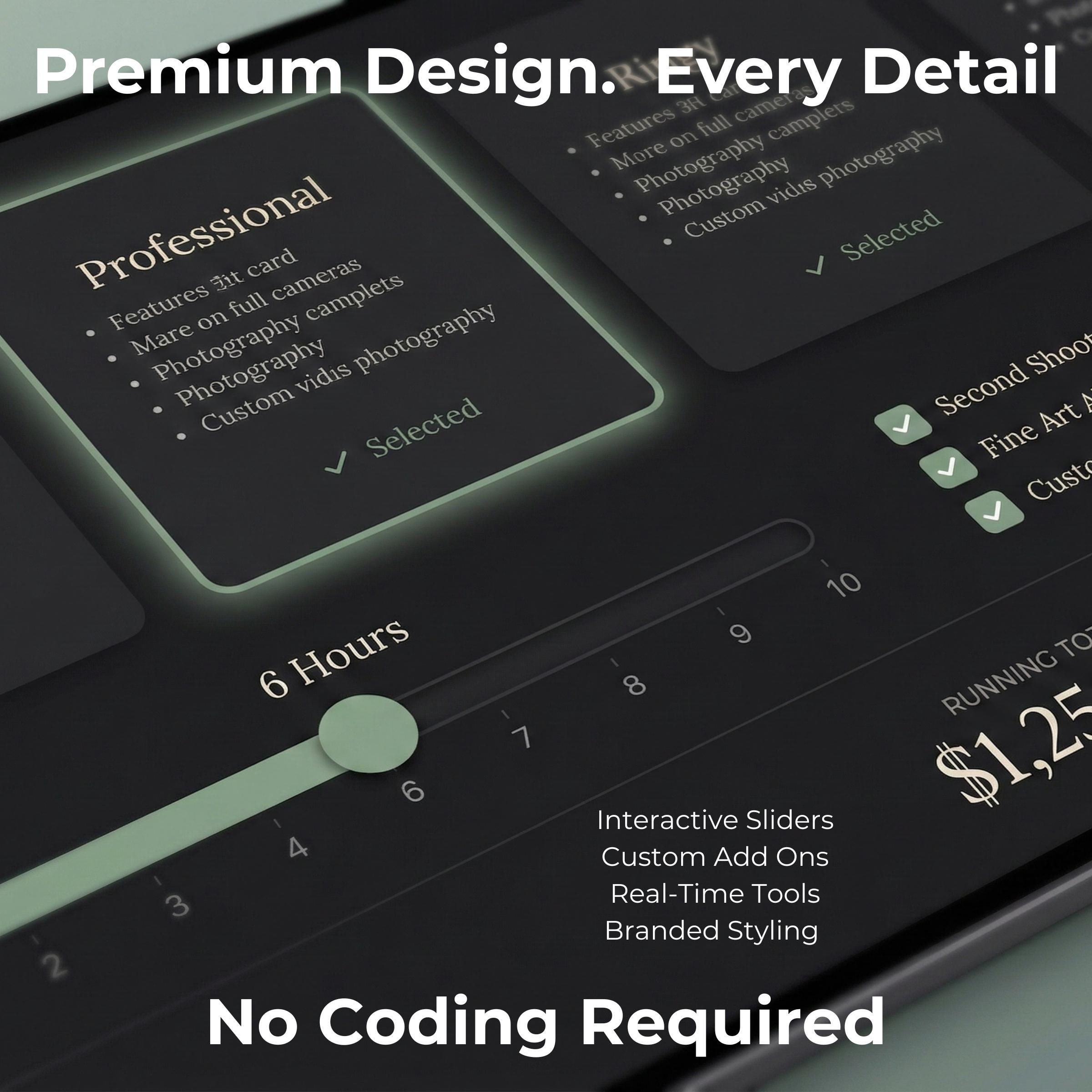 Introducing the Photography Quote Calculator Configurator: a professional, interactive pricing tool that lives on YOUR website, captures leads, and sets client expectations—without monthly SaaS fees, developer costs, or technical skills.
